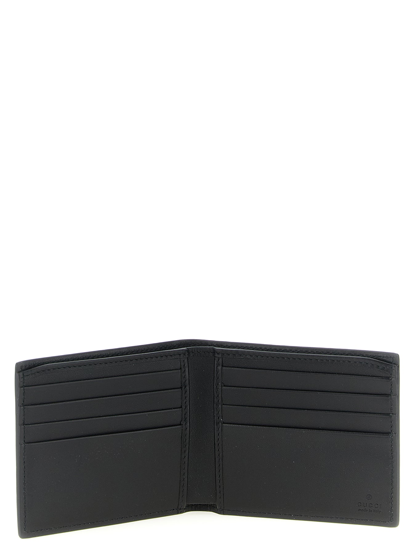'GG Emblem' smooth leather wallet with embossed GG pattern, taffeta lining, bi-fold style, book opening.