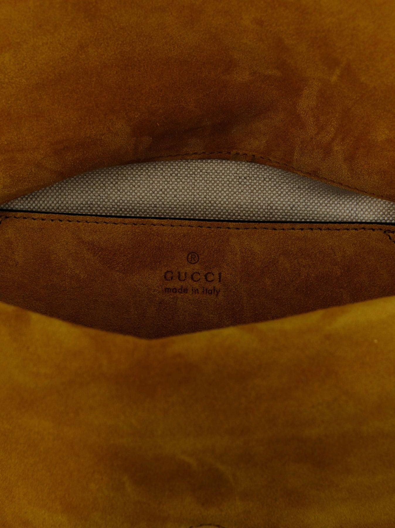 Medium suede shoulder bag with embossed GG, cotton and linen lining, two-bellows construction, magnetic flap closure, antiqued effect chain handle with fixed 'Incrocio GG' detail, adjustable and removable leather shoulder strap.