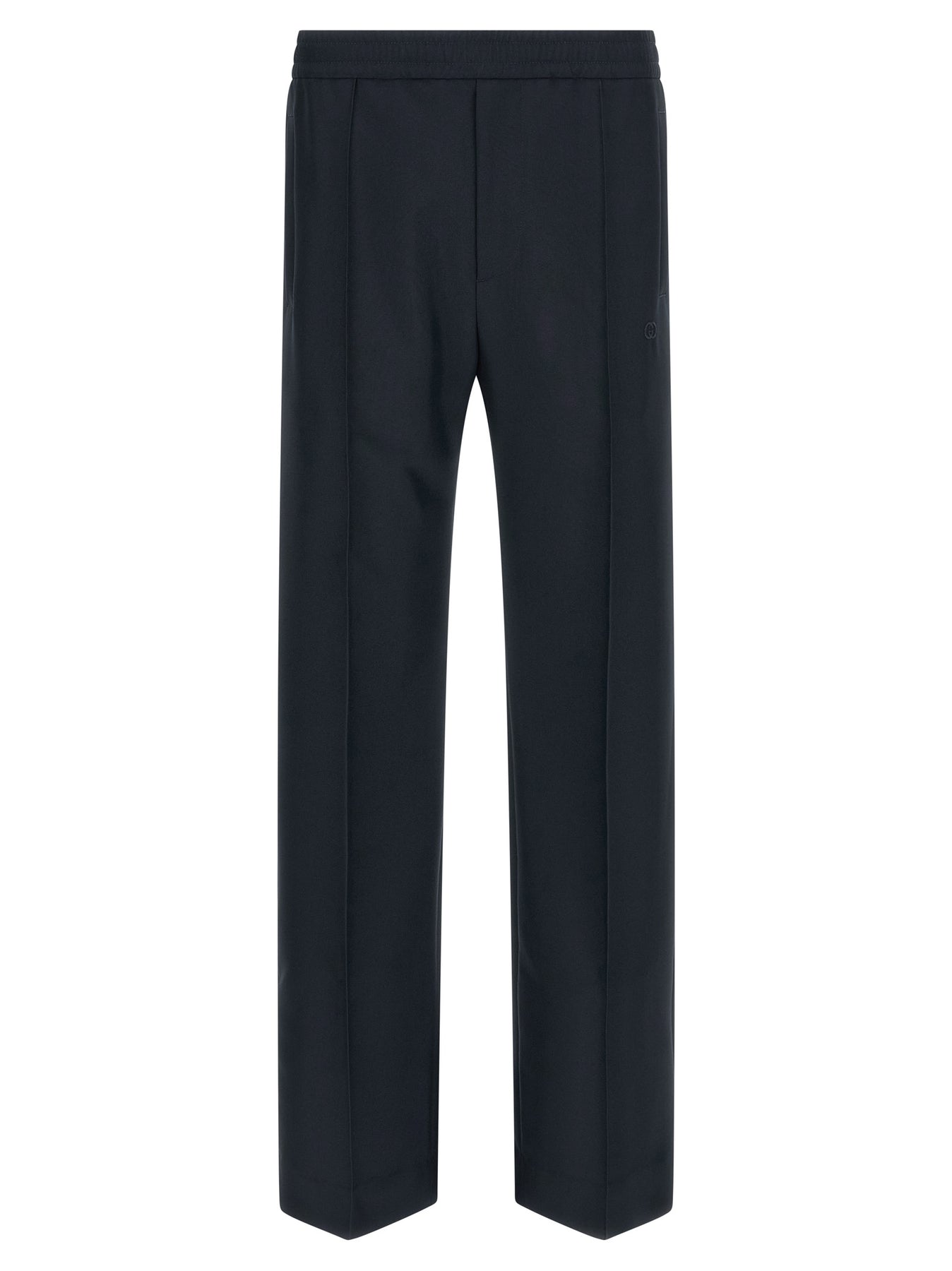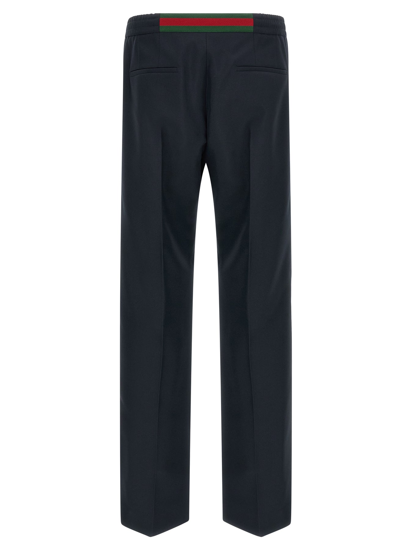 Technical panama pants, elastic and drawstring at the waist with back Web ribbon detail, tone-on-tone logo embroidery on the front, zip flap, pockets, central stitching, straight leg.