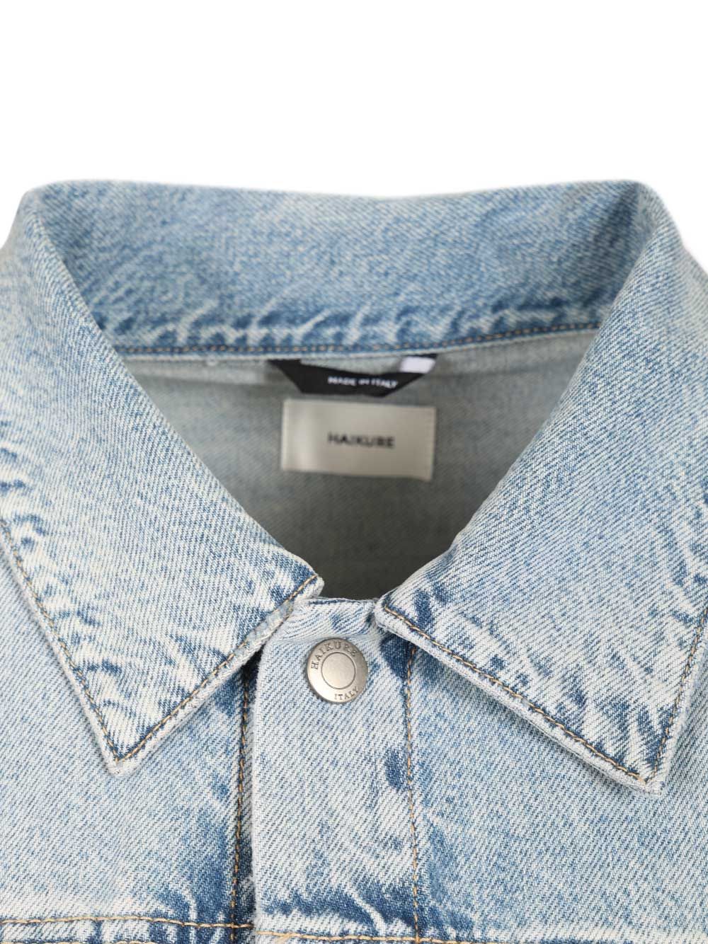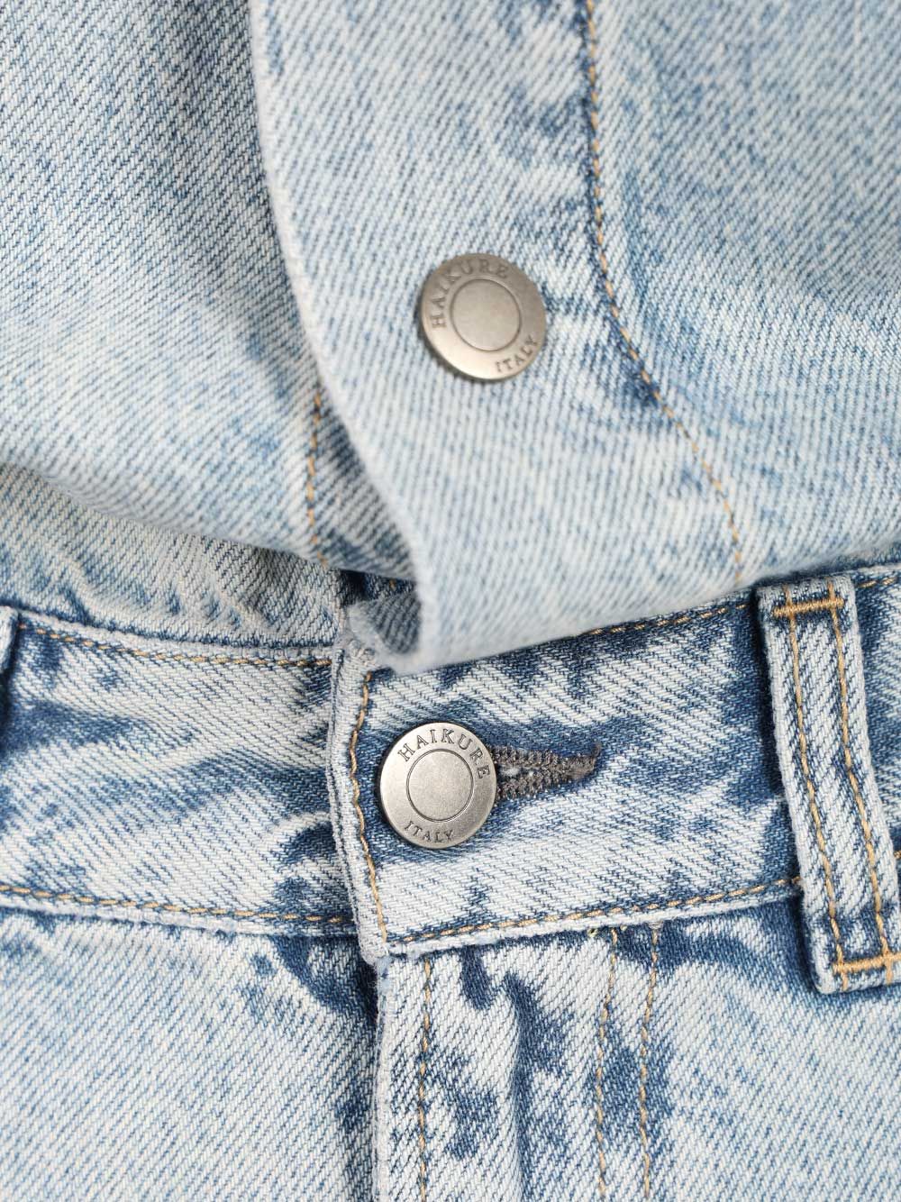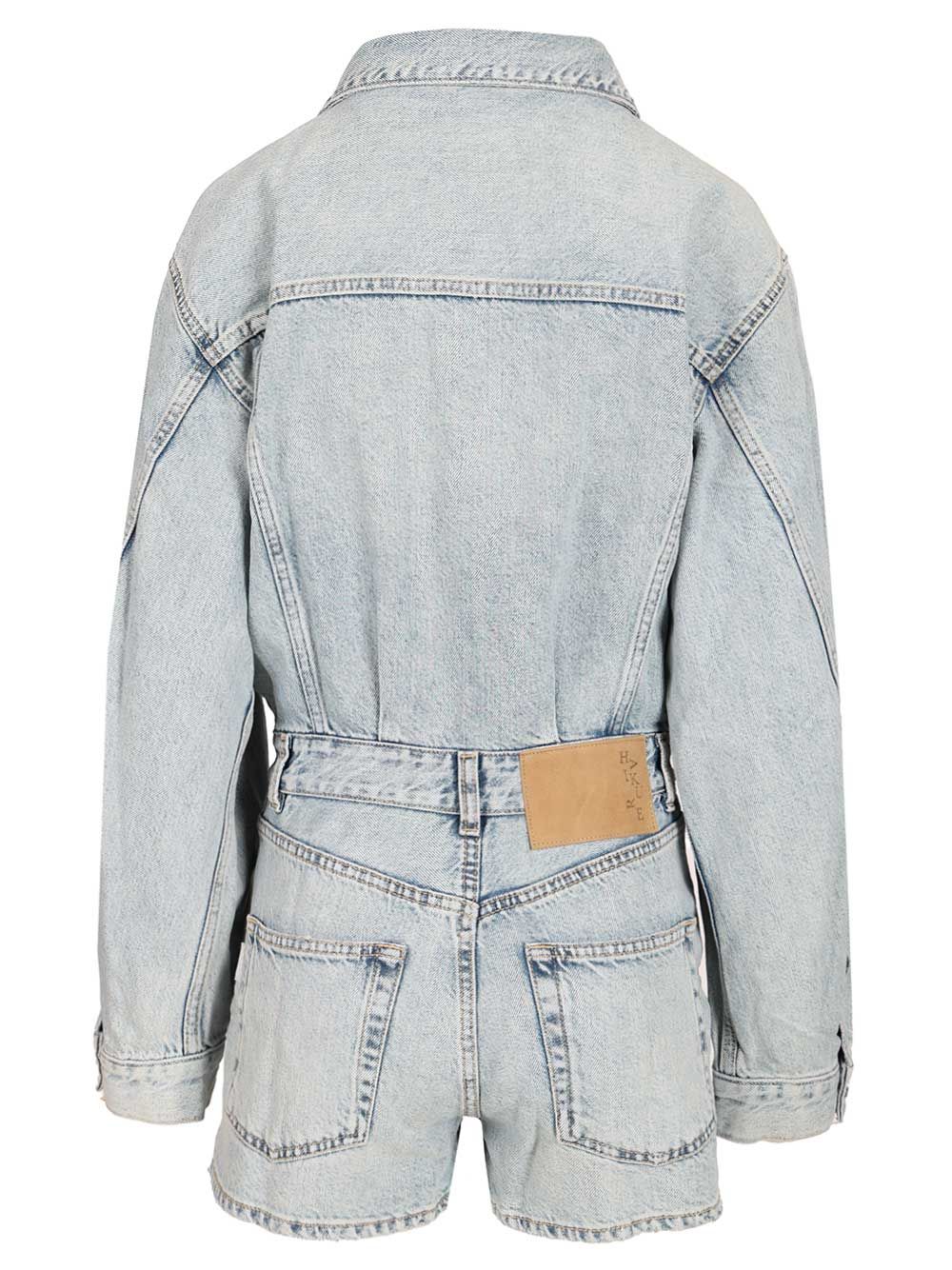 Denim overalls with shirt collar, five-pocket shorts, snap button closure, patch pockets with flap and button, light wash.