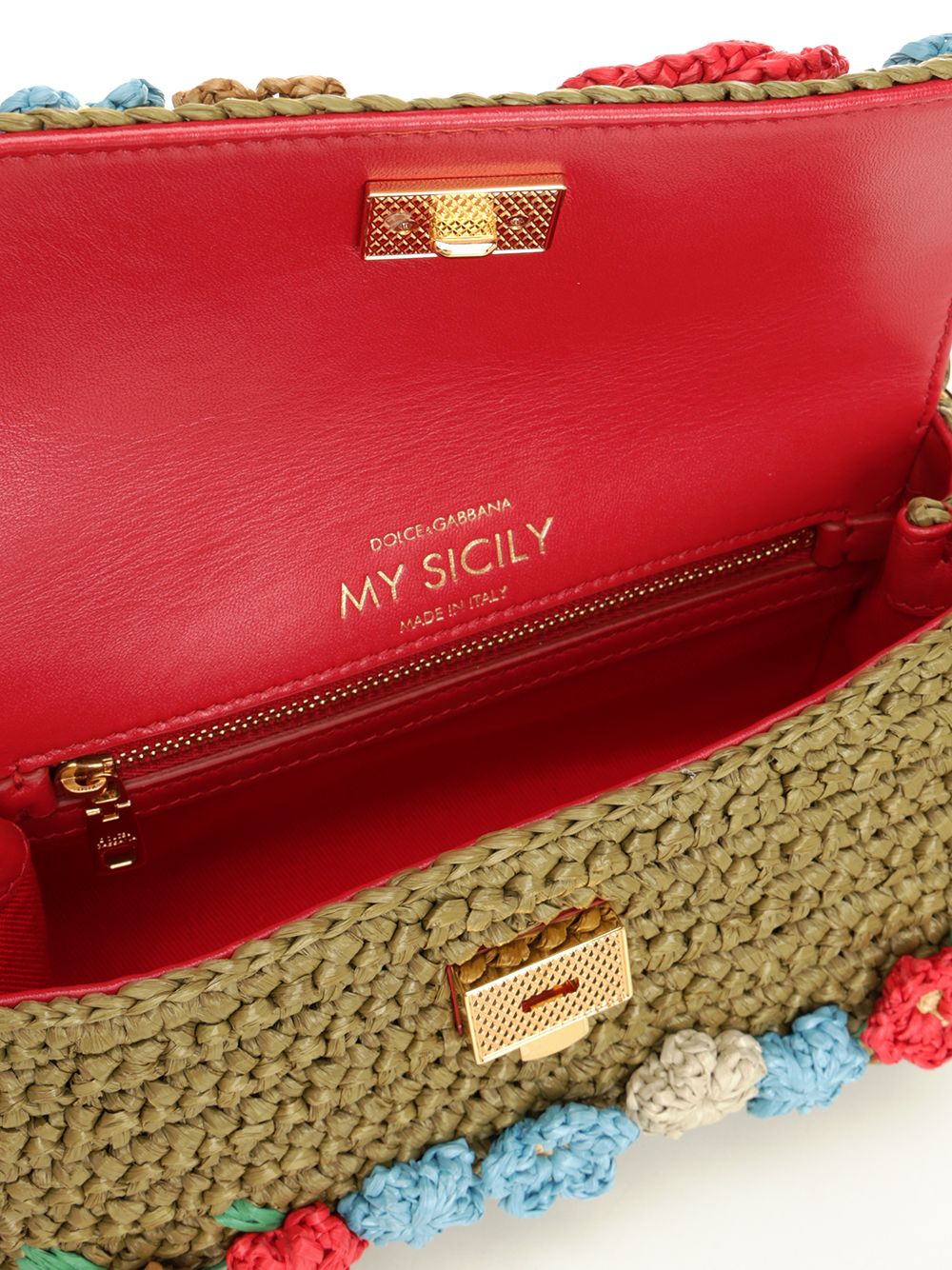 My Sicily Raffia Crochet Handbag: Multicolor. Leather handle, removable and adjustable leather shoulder strap. Tuck-in closure. Vintage brass plating. External customization with mono-galvanic tag and foil stamp. Internal customization with foil stamp. Interior with zip pocket.