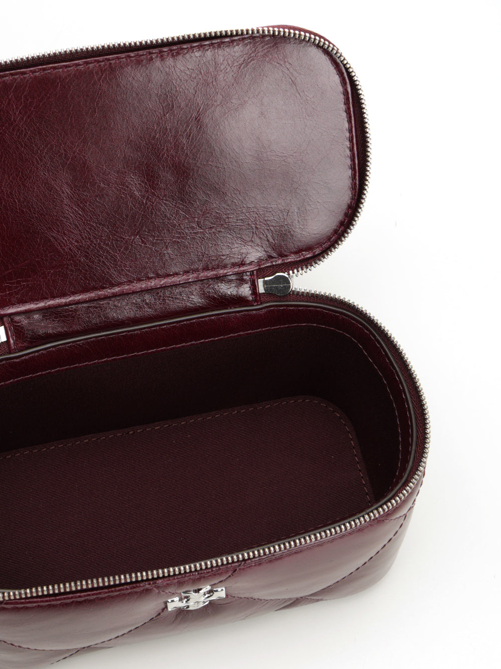 Leather vanity case with chain shoulder strap, zip closure, leather handle, metal logo