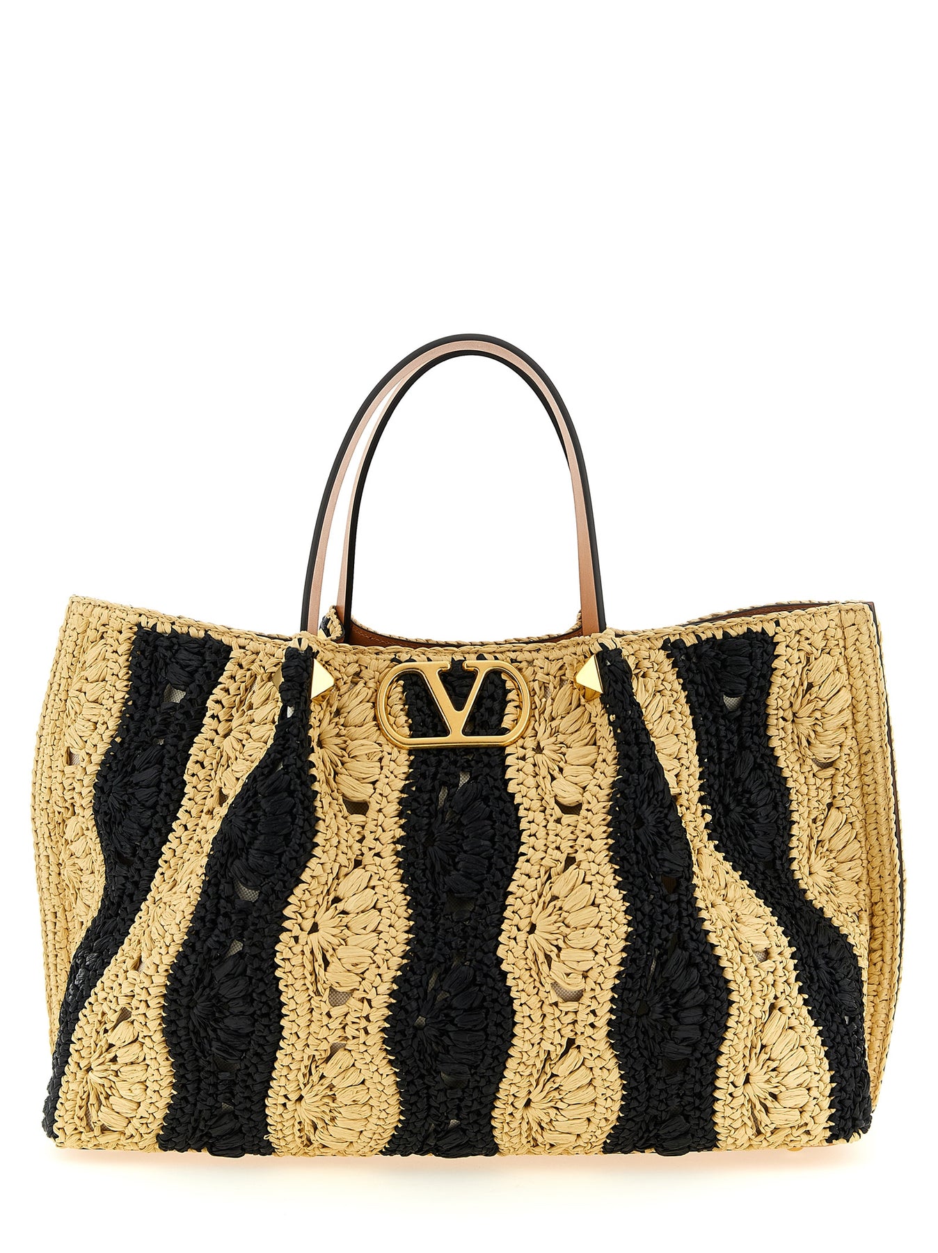 'VLogo Signature' raffia handbag with two-tone crochet processing, wave processing, double fixed leather handle, studs and metal parts in antique brass finish, removable inner pouch, metal feet on the bottom, metal 'VLogo Signature' on the front, adjustable and removable leather shoulder strap.