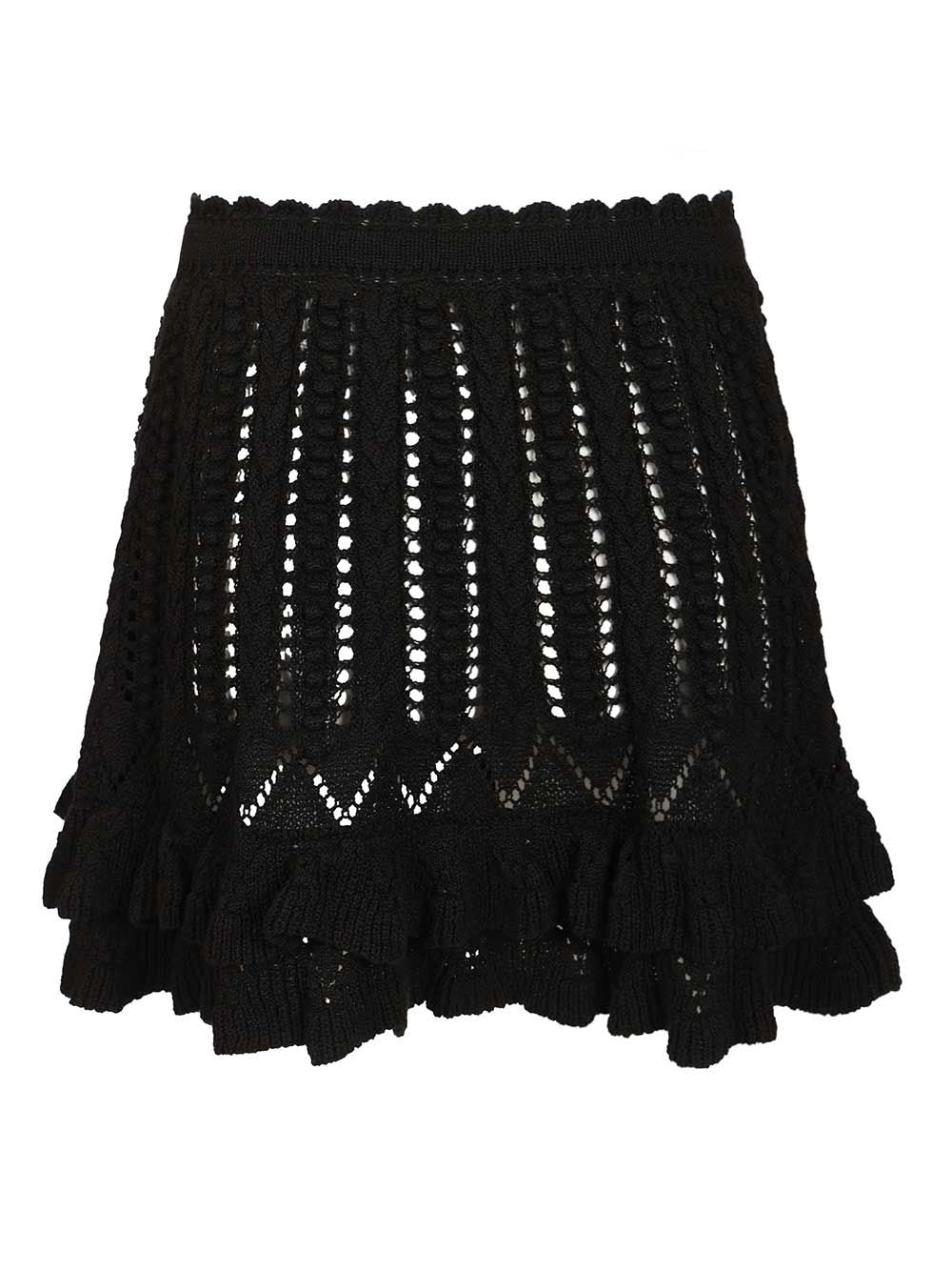"Nelle" flared mini skirt by Marant Étoile in cotton knit with an openwork pattern and ruffle hem. Elastic waistband.