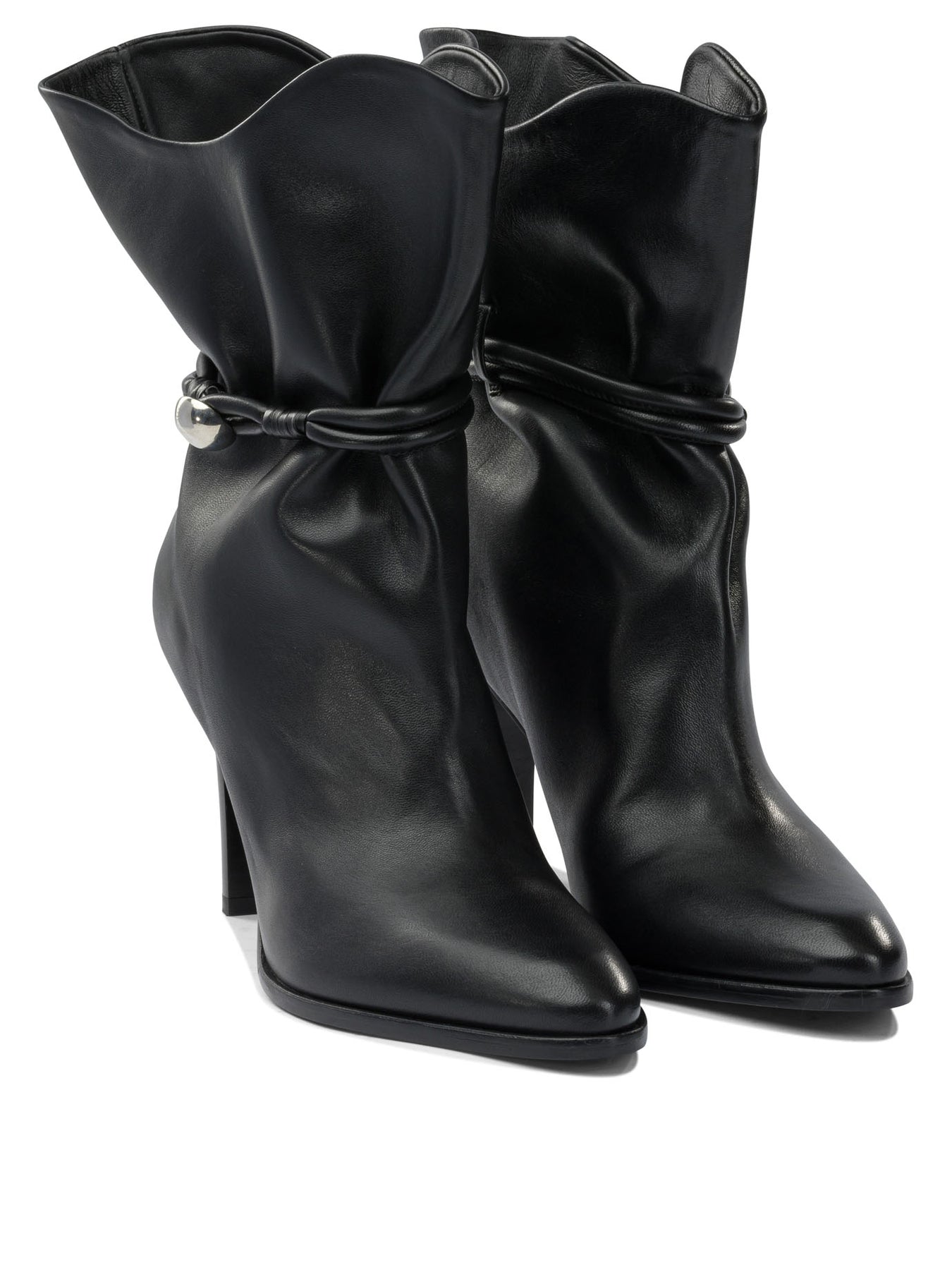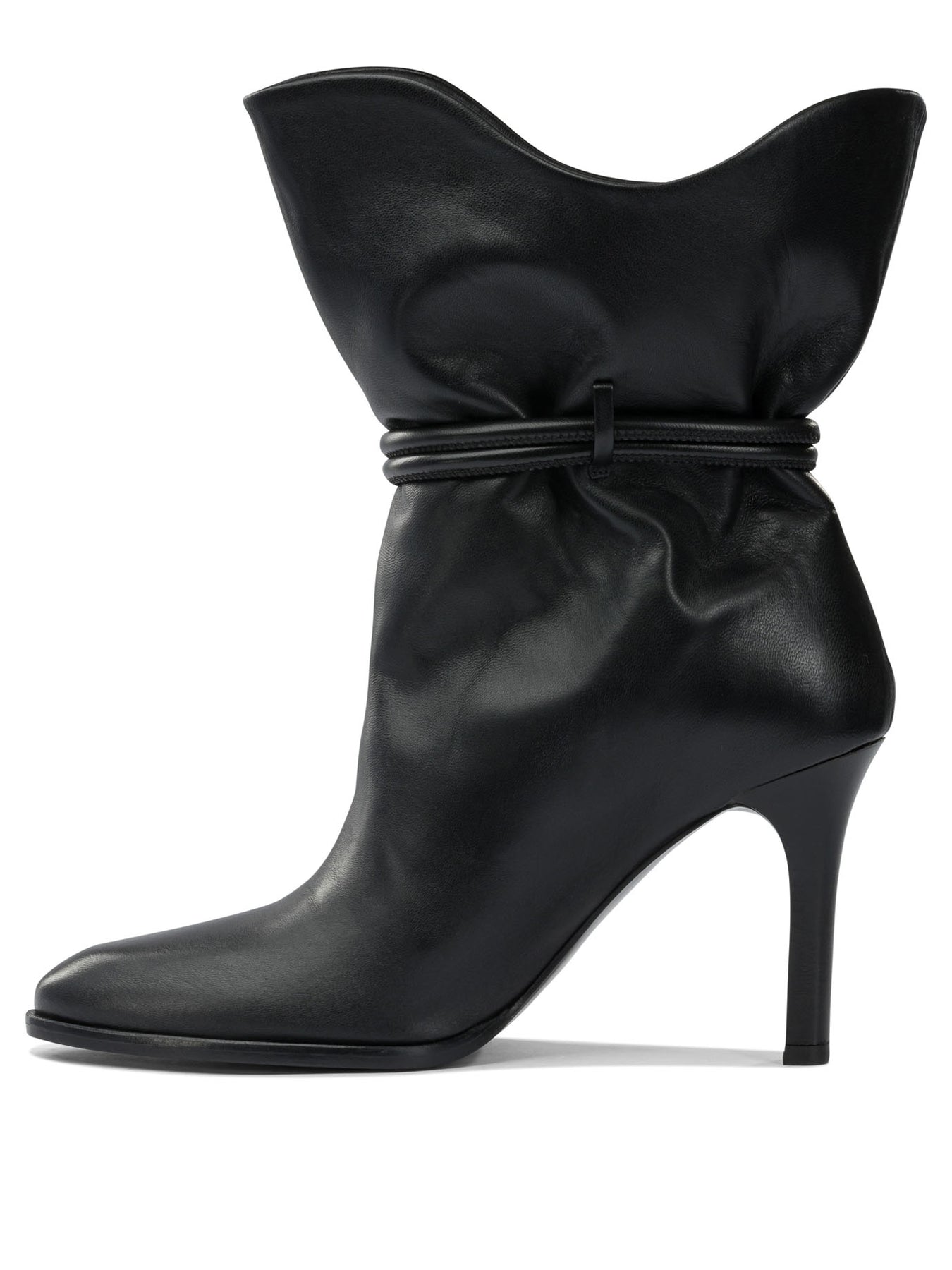 Isabel Marant "Lolya" 80 mm ankle boots from Isabel Marant leather upper with soft structure and rounded shapes. The fine leg ends with a rounded profile. Distinctive detail given by the applied leather ribbon motif that follows the line of the ankle. Construction without visible fasteners, with smooth leather sole. Compact silhouette and structured design, leather main material. || - Smooth leather upper - Leather ribbon pattern detail - Shaped rounded shank - Construction without visible closures