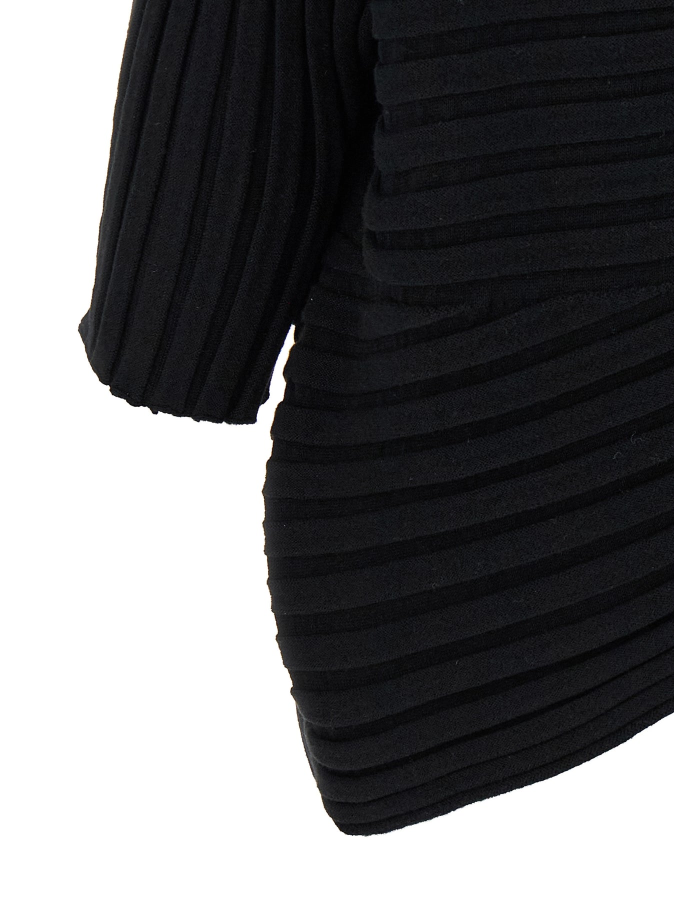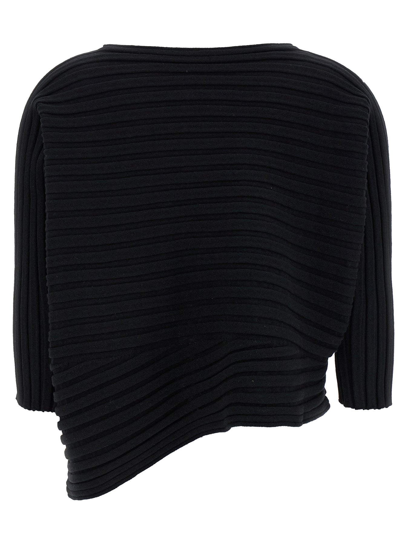 'Cotton Cashmere Knit' top made of cashmere knit using a mix of two knit structures with an irregular consistency, unique straight silhouette created by the combination of the two knit structures in the warp and weft, round neckline, 3/4 sleeves, asymmetrical hem.