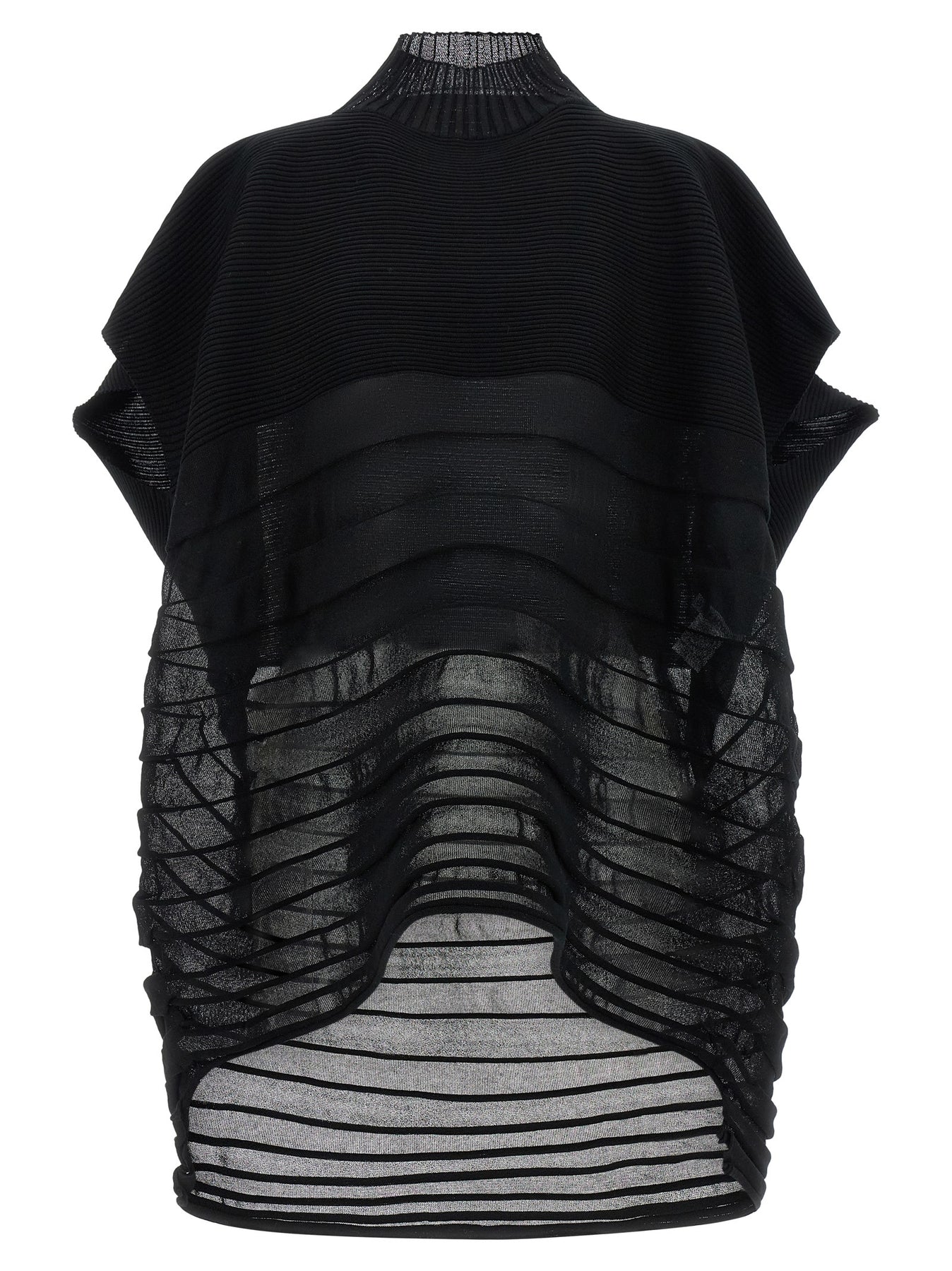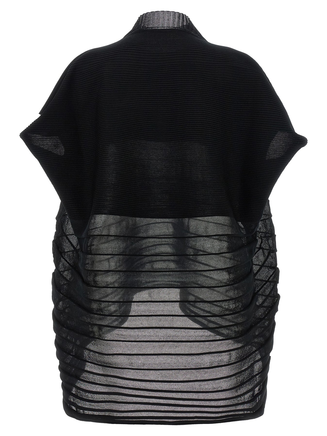 'Moving Knit' fabric top with contrasting knitted structures that create a light and elastic texture, high neck, short sleeves, asymmetrical hem.