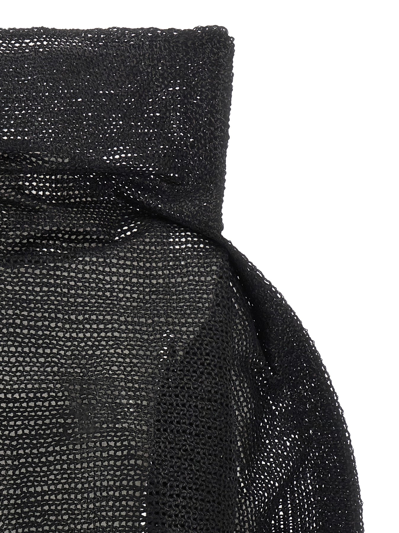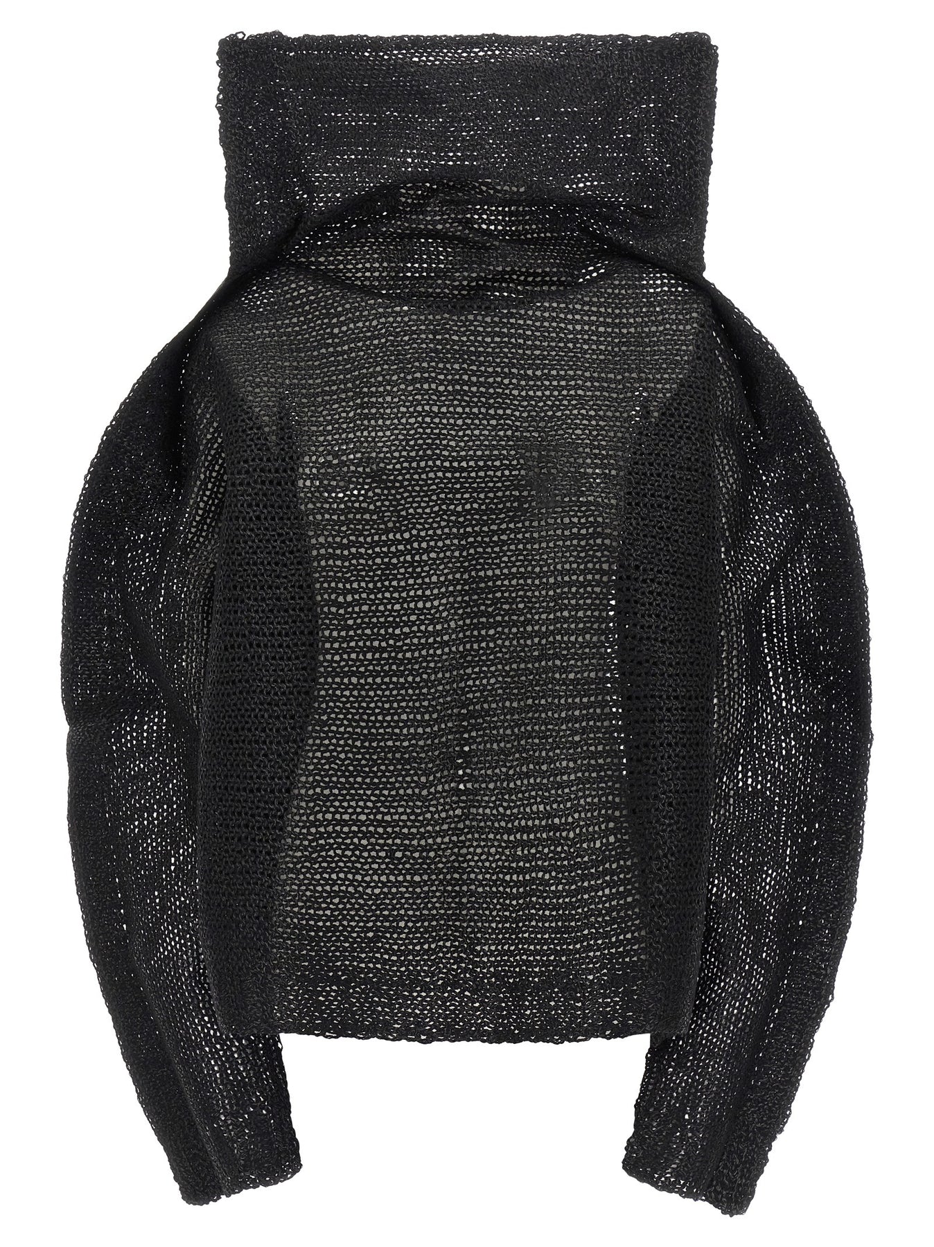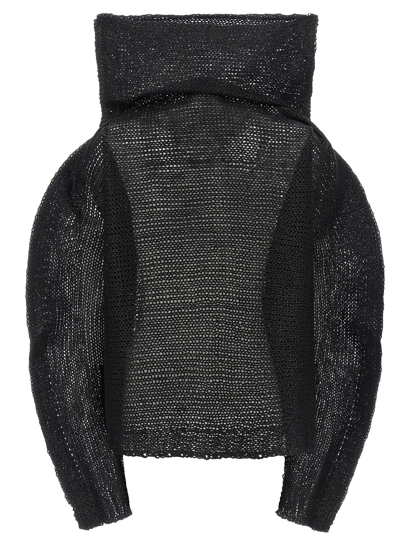 'Panini' wool and alpaca yarn blend top with thermoplastic synthetic fibers, exaggerated fake collar, extra long sleeves with slit on the cuffs.