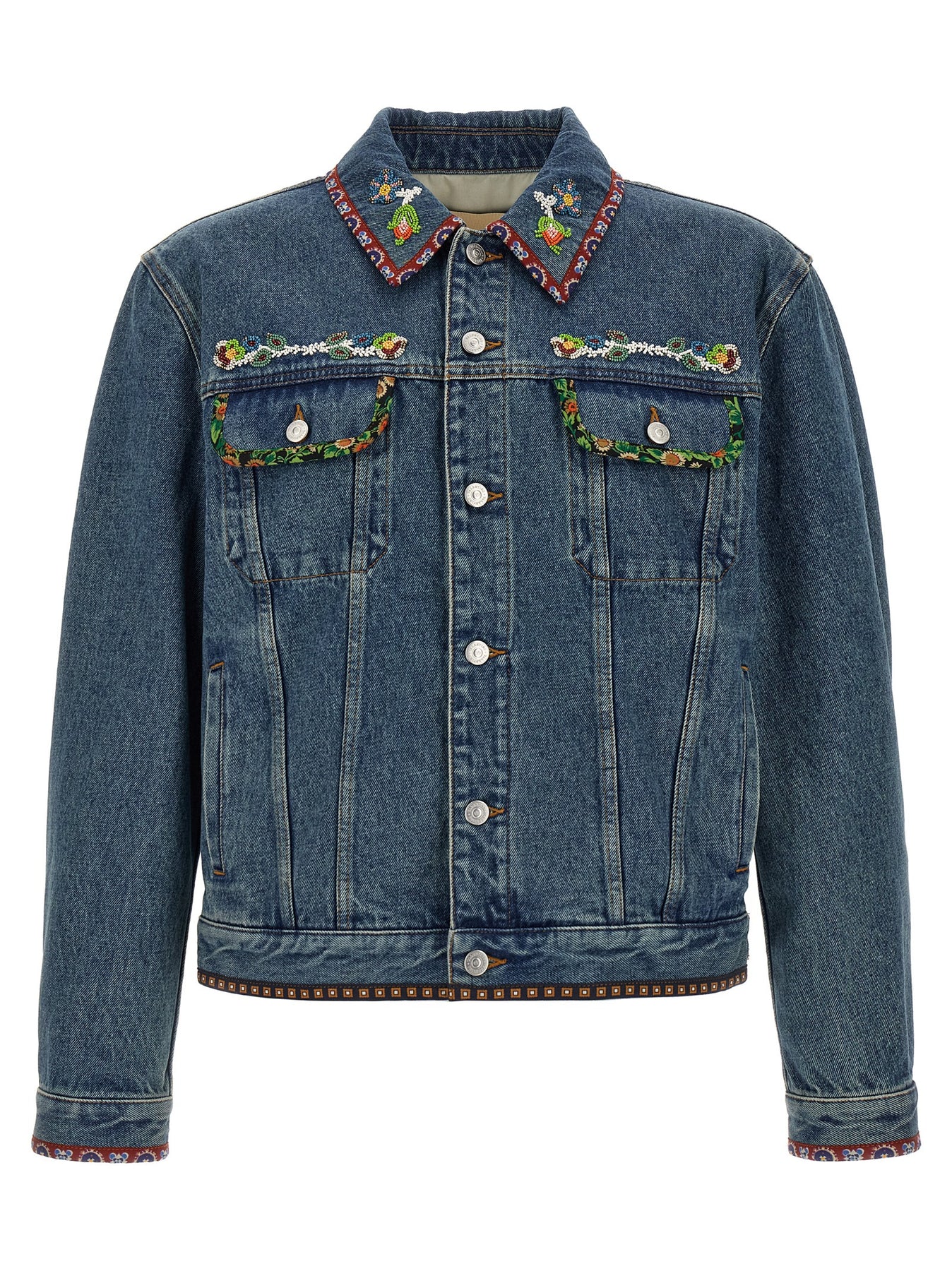 Cotton denim jacket with beaded embroidery and floral printed fabric piping, front button closure, pockets, long cuffed sleeves, and leather logo label on the back.