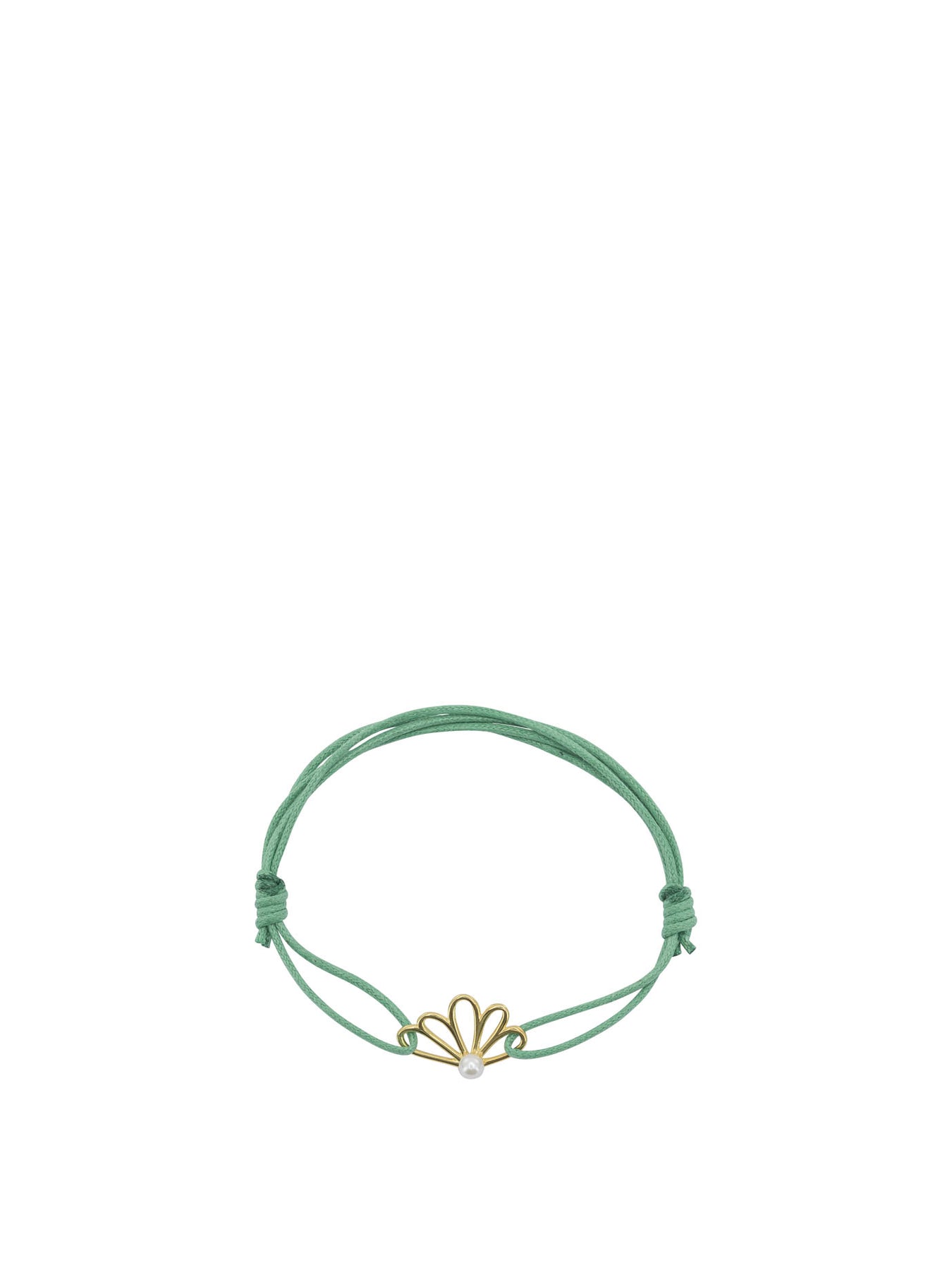 Aliita's "Pernula Perla" bracelet, constructed with an adjustable fabric cord that supports a pendant made of brass. The structure of the bracelet features an essential shape, where the pendant is distinguished by a stylized flower-shaped outline. A smooth surface pearl is centrally set in the pendant, an element that characterizes the visual linearity of the jewelry. || - Adjustable fabric lanyard - Brass pendant with applied pearl - Smooth finish of the pendant - Design without visible metal clasps - Adjustable length with sliding system