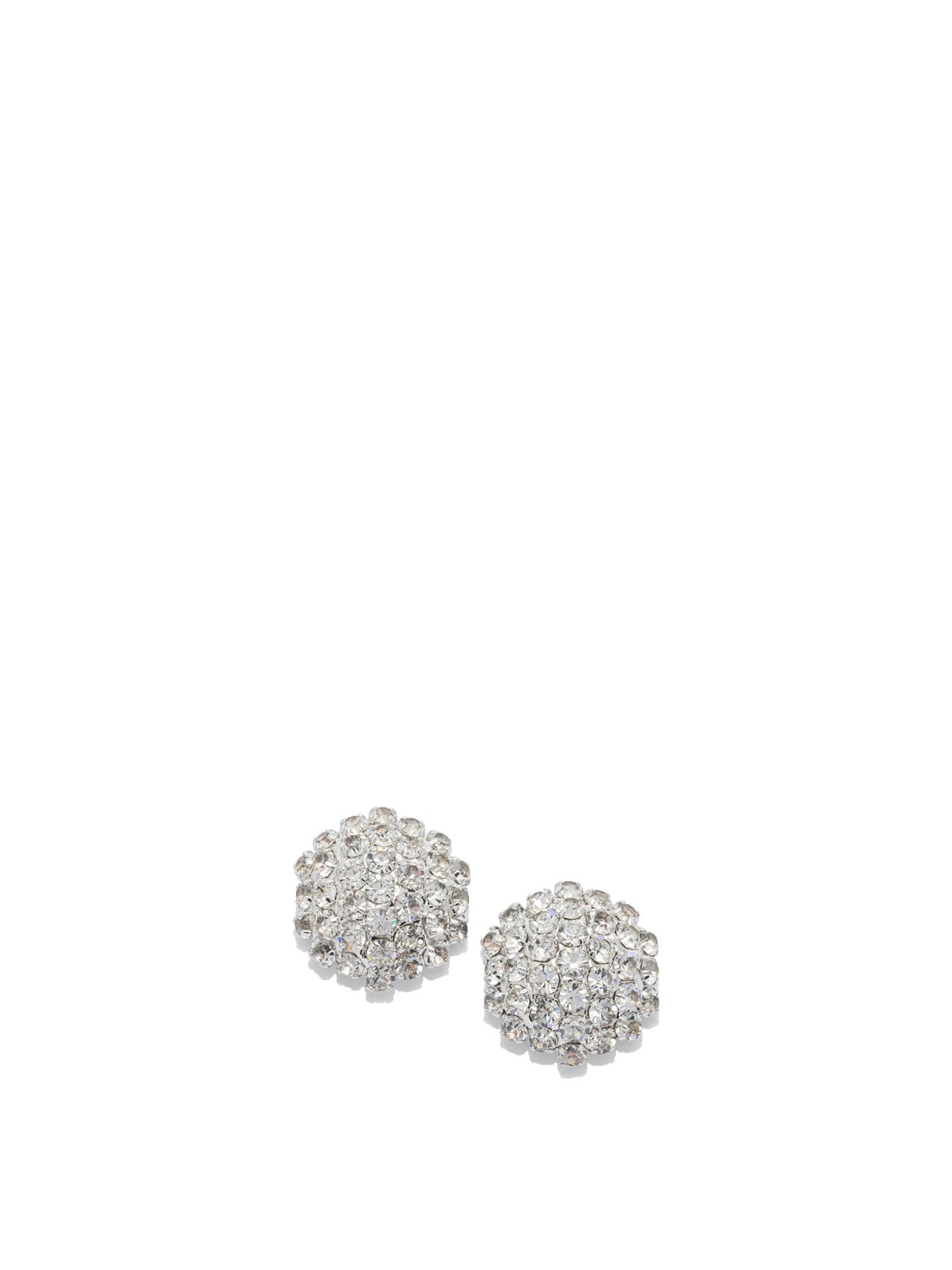 Self-portrait crystal earrings made of silver-plated brass. The button construction features a compact structure defined by metal elements assembled in clusters. Crystals of various sizes are applied to the surface to form a floral composition. The pivot mount ensures a stable fit and secure closure. Round silhouette and shiny metal details characterize the overall finish. || - Silver-plated brass - Crystal embellishment - Pivot stand - Cluster structure with floral elements