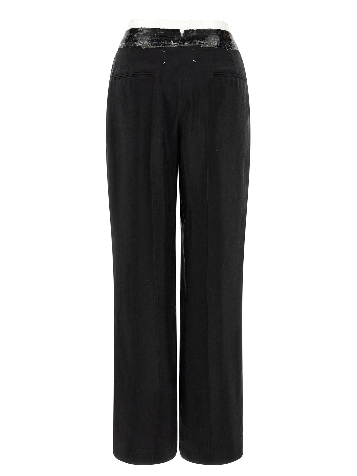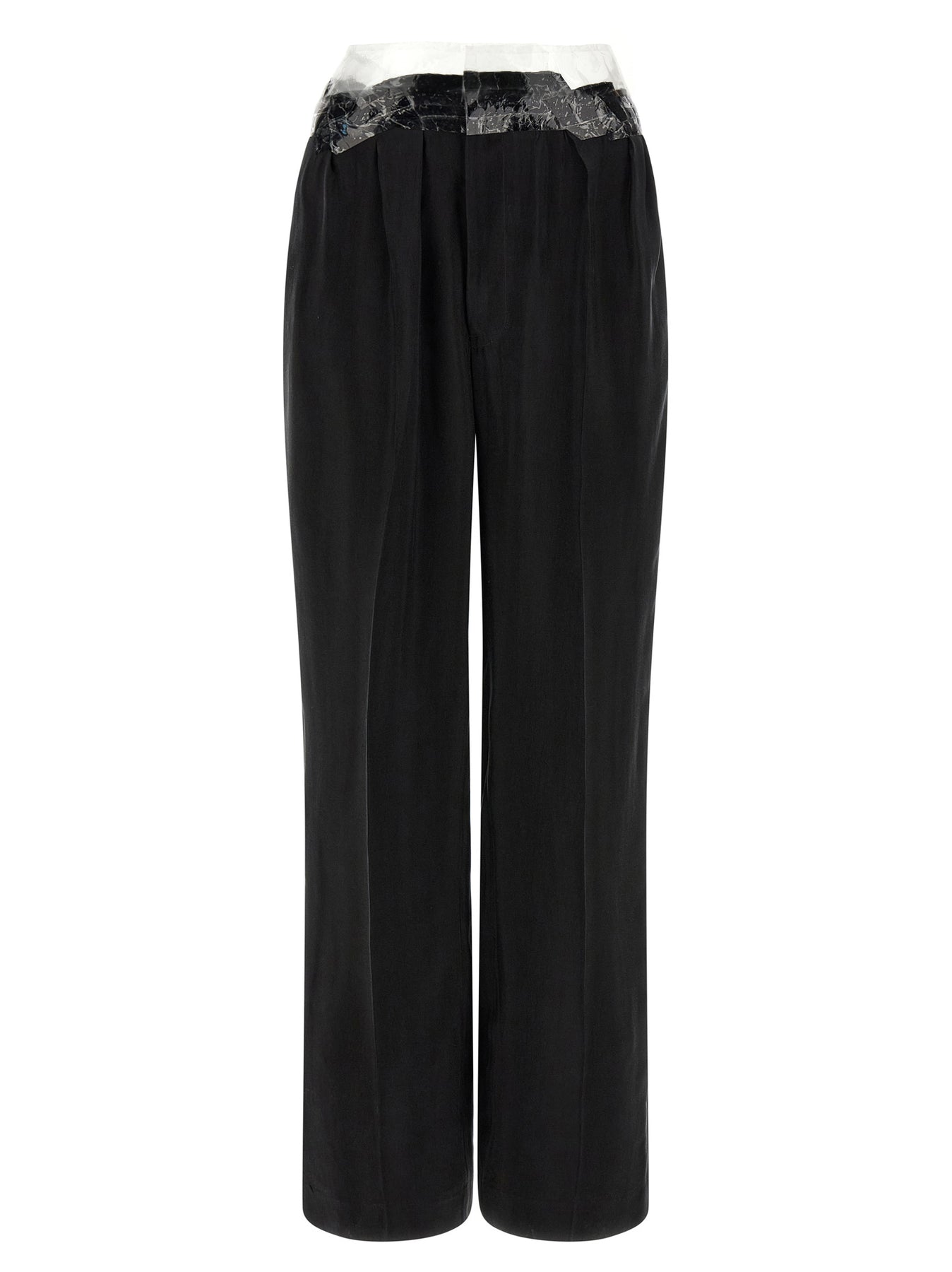 'Taped' fluid cupro pants, pince, stretched pleat, wide and straight leg, transparent tape at the waist, hook and front button zip closure, front French pockets, welt pockets and 'Four Stitches' at the back.