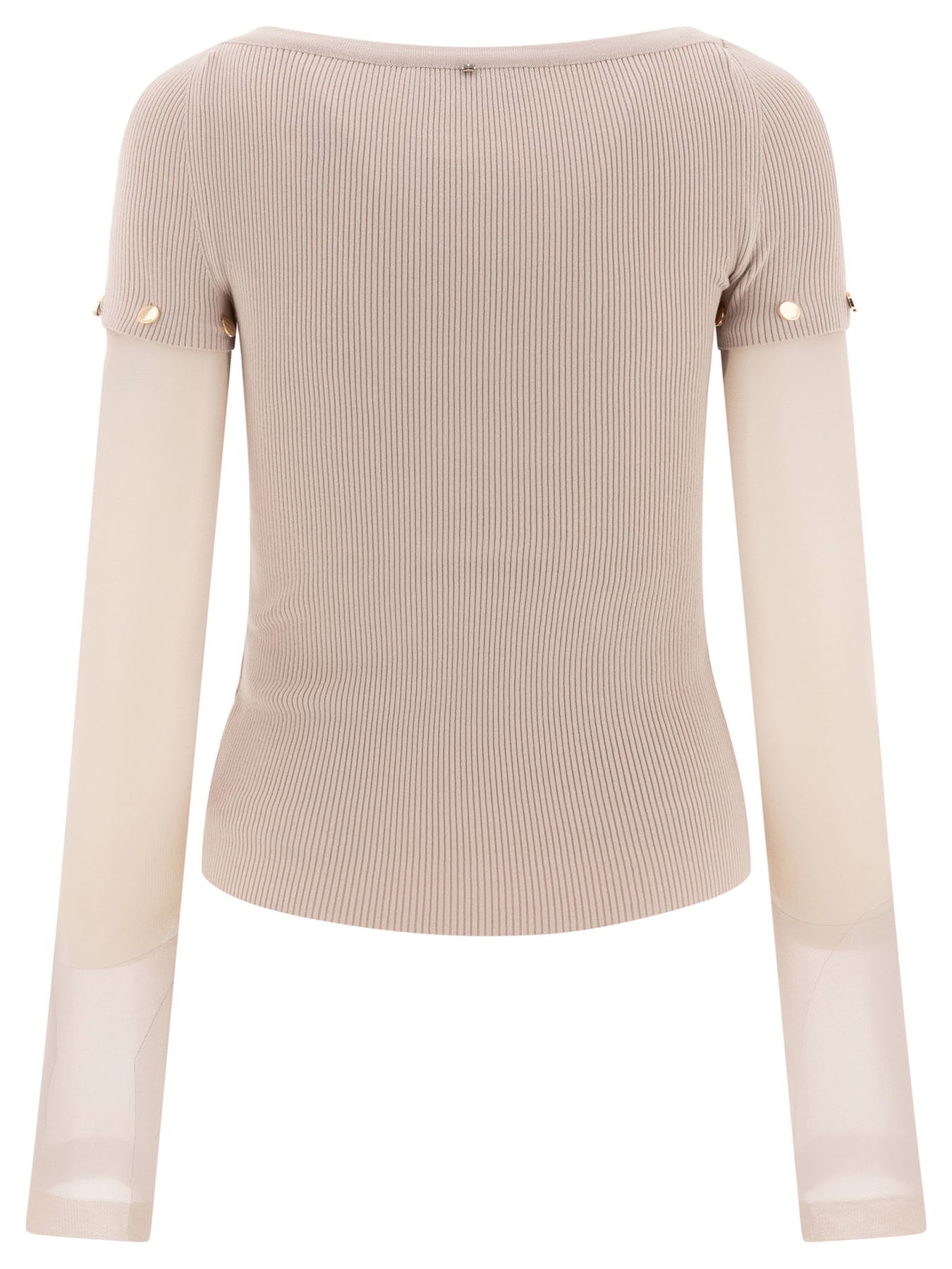 Max Mara Sportmax crew-neck T-shirt in medium-weight stretch viscose, featuring a regular line and fitted structure. The garment features a boat neckline and removable long sleeves, made of transparent viscose, secured by custom buttons. Front stockings draw the bust line. The construction combines a compact knit and functional details designed for modularity and versatility of use. || - Solid color - Removable long sleeves made of transparent viscose - Custom sleeve buttons - Bateau neckline - Embossed front piping - Medium-weight stretch fabric - Regular fit
