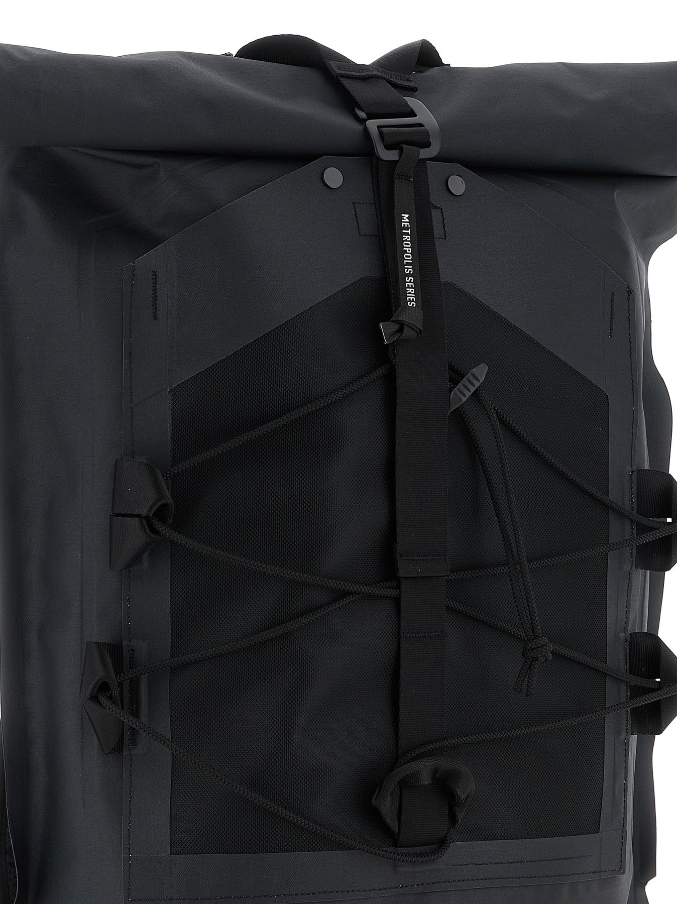 'The Metropolis Series' backpack in Rubber Reps Mixed, adjustable rollable velcro closure with snap buttons, front mesh pocket with drawstring, snap button and velcro flap, adjustable padded shoulder straps, pockets.