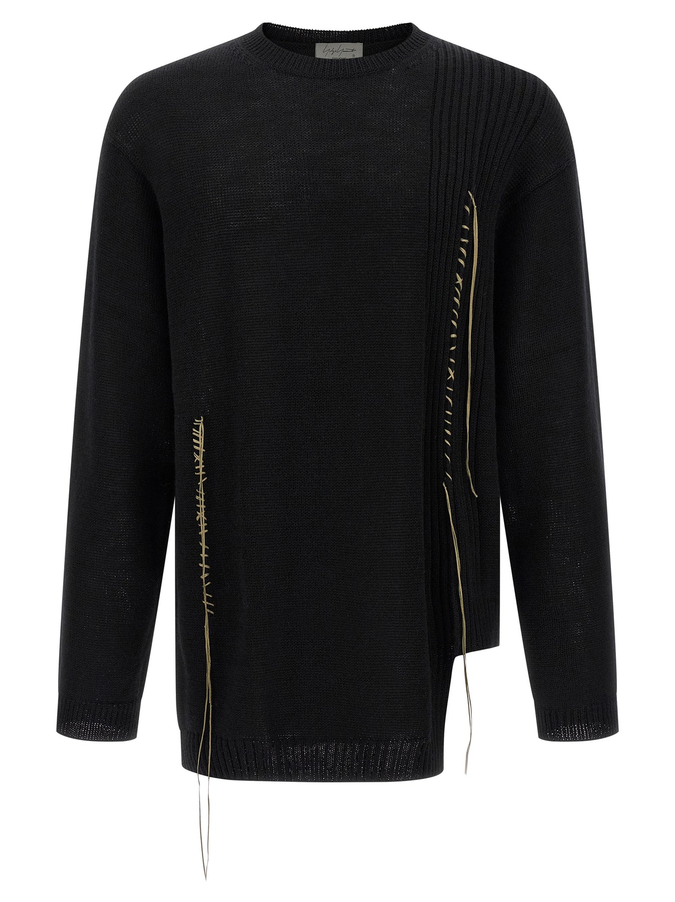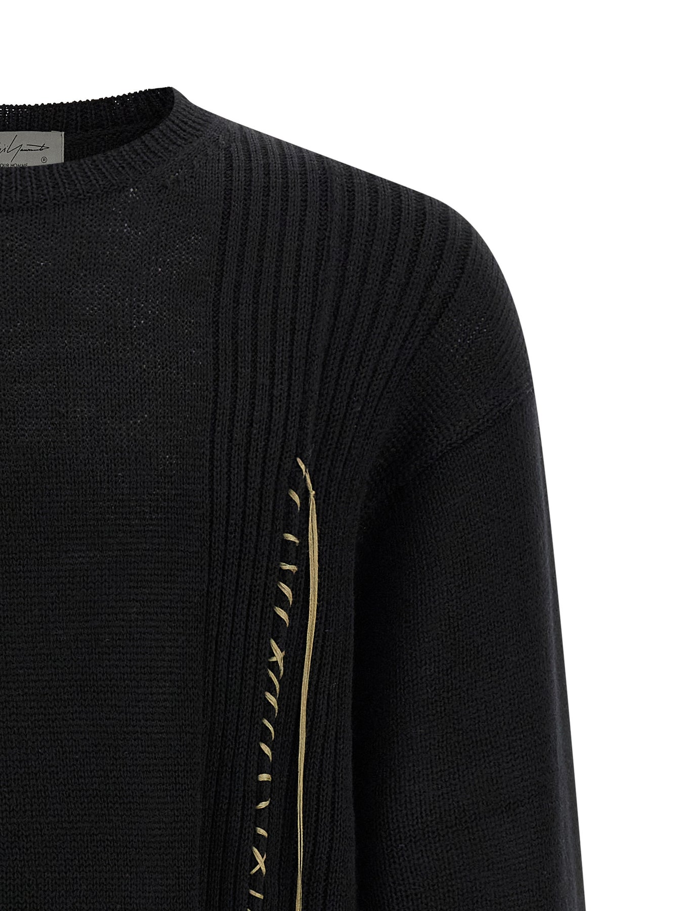 Wool sweater with contrast embroidery, round neckline, long sleeves with cuffs and dropped shoulders, asymmetrical hem with side split.