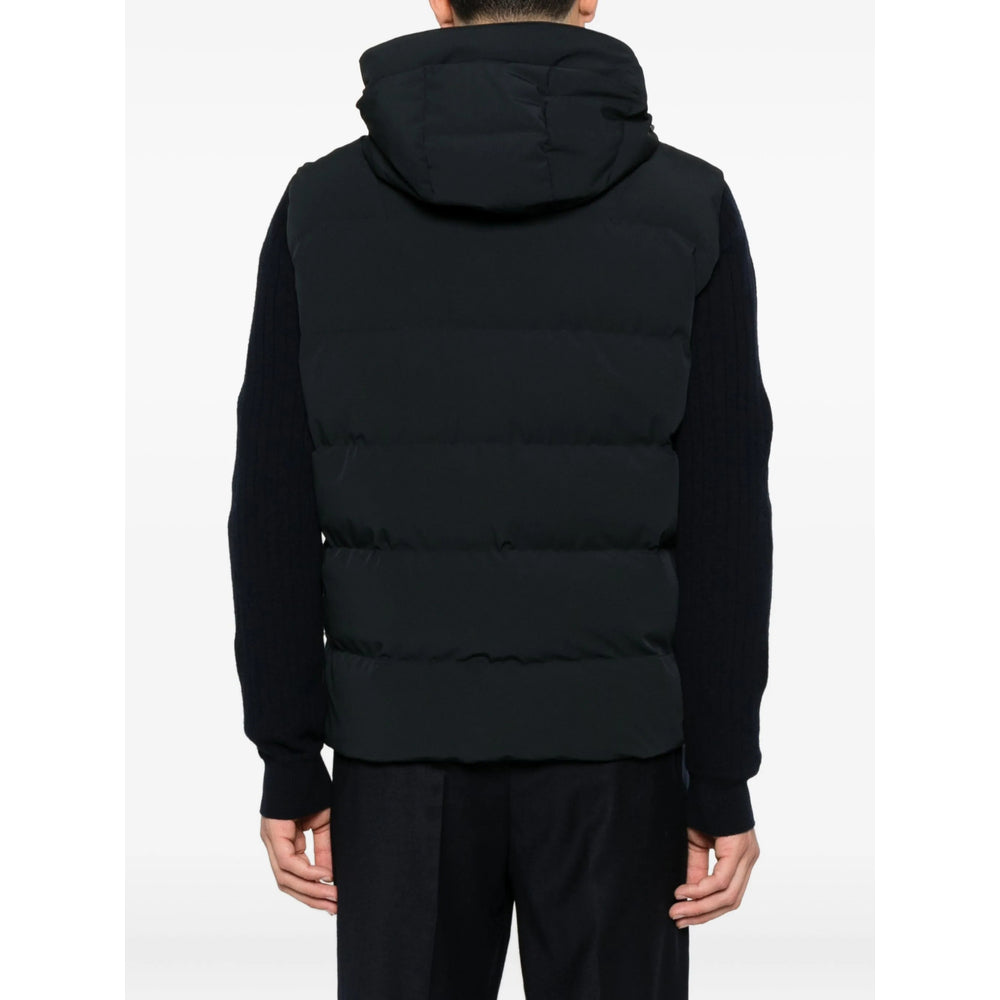 black quilted design zip fastening sleeveless attached hood welt pockets