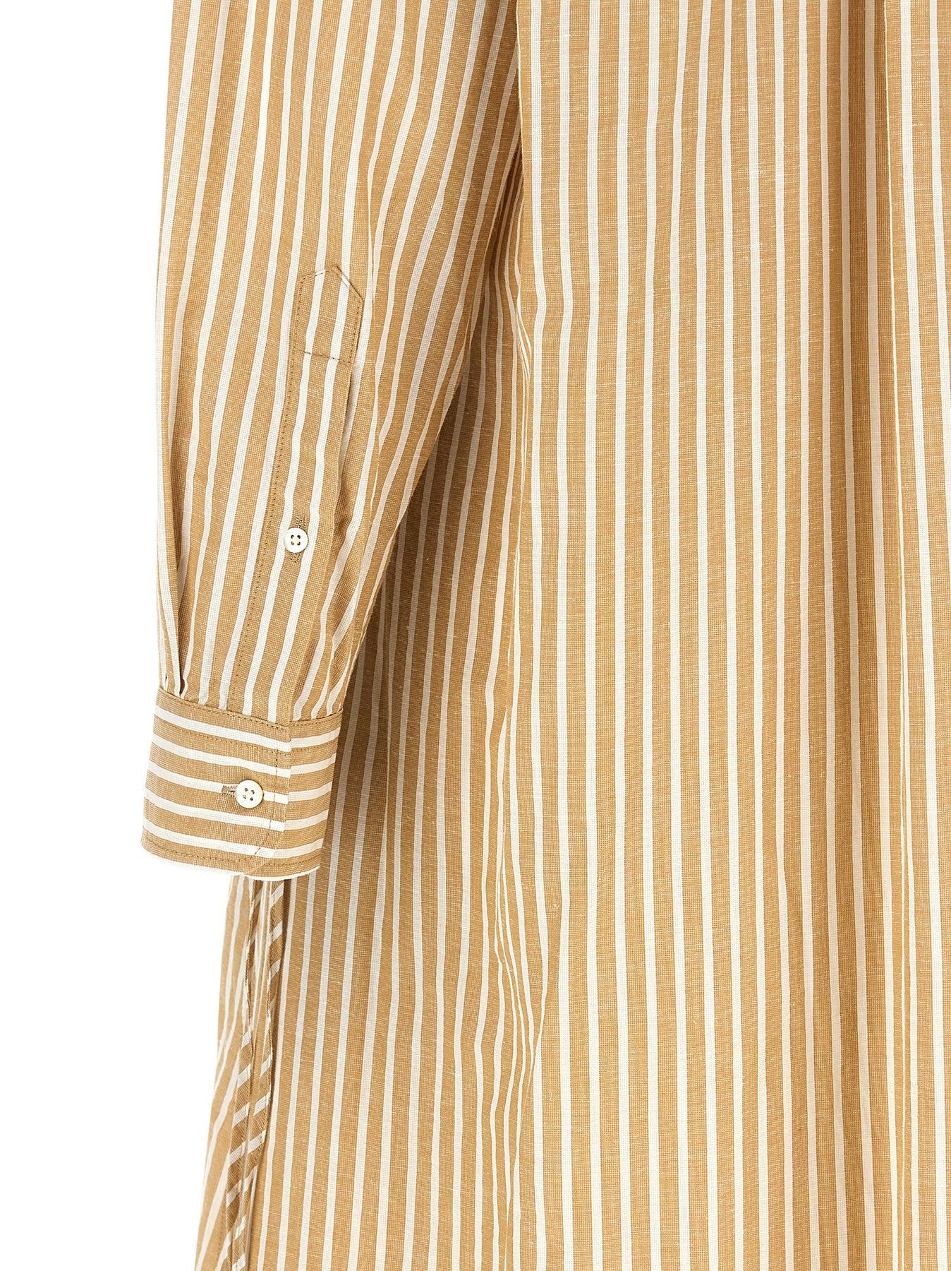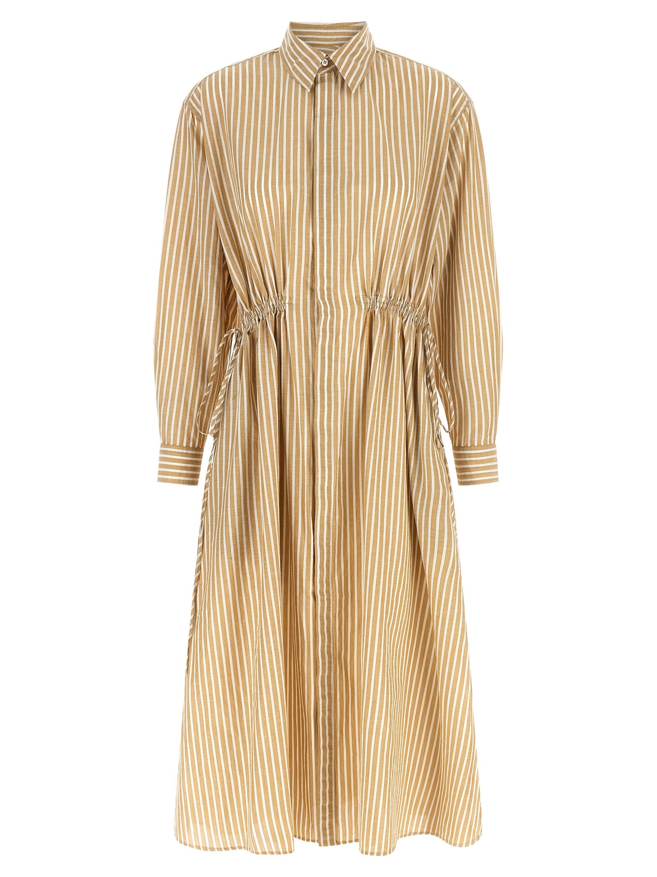 Striped cotton and linen midi dress with chemisier style, trapeze silhouette, concealed front button closure, front drawstring at the waist, long cuffed sleeves, side slits.