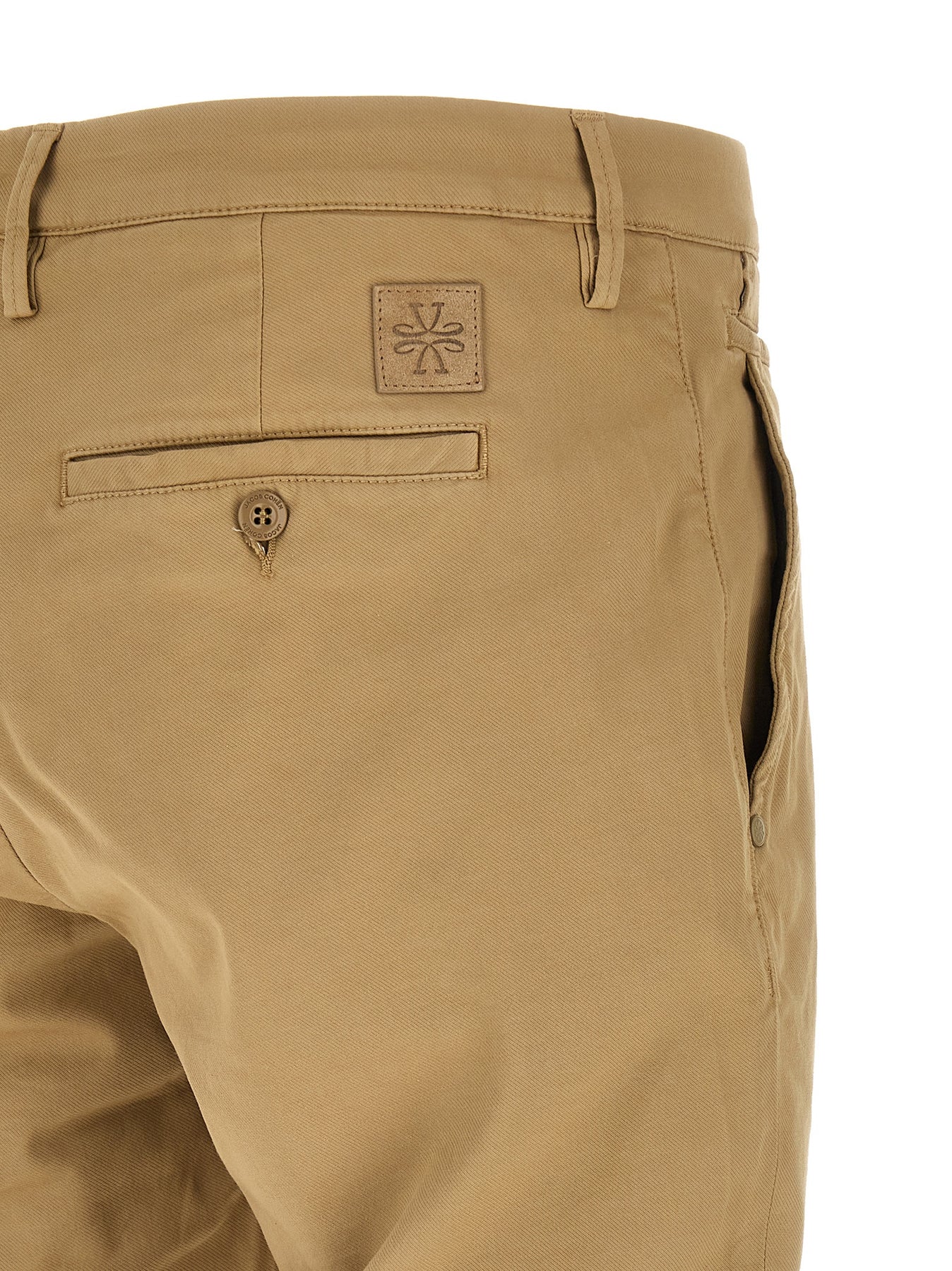 'Bobby' cotton blend chinos, low waist, straight leg, pockets, front zip and button closure, back logo patch.
