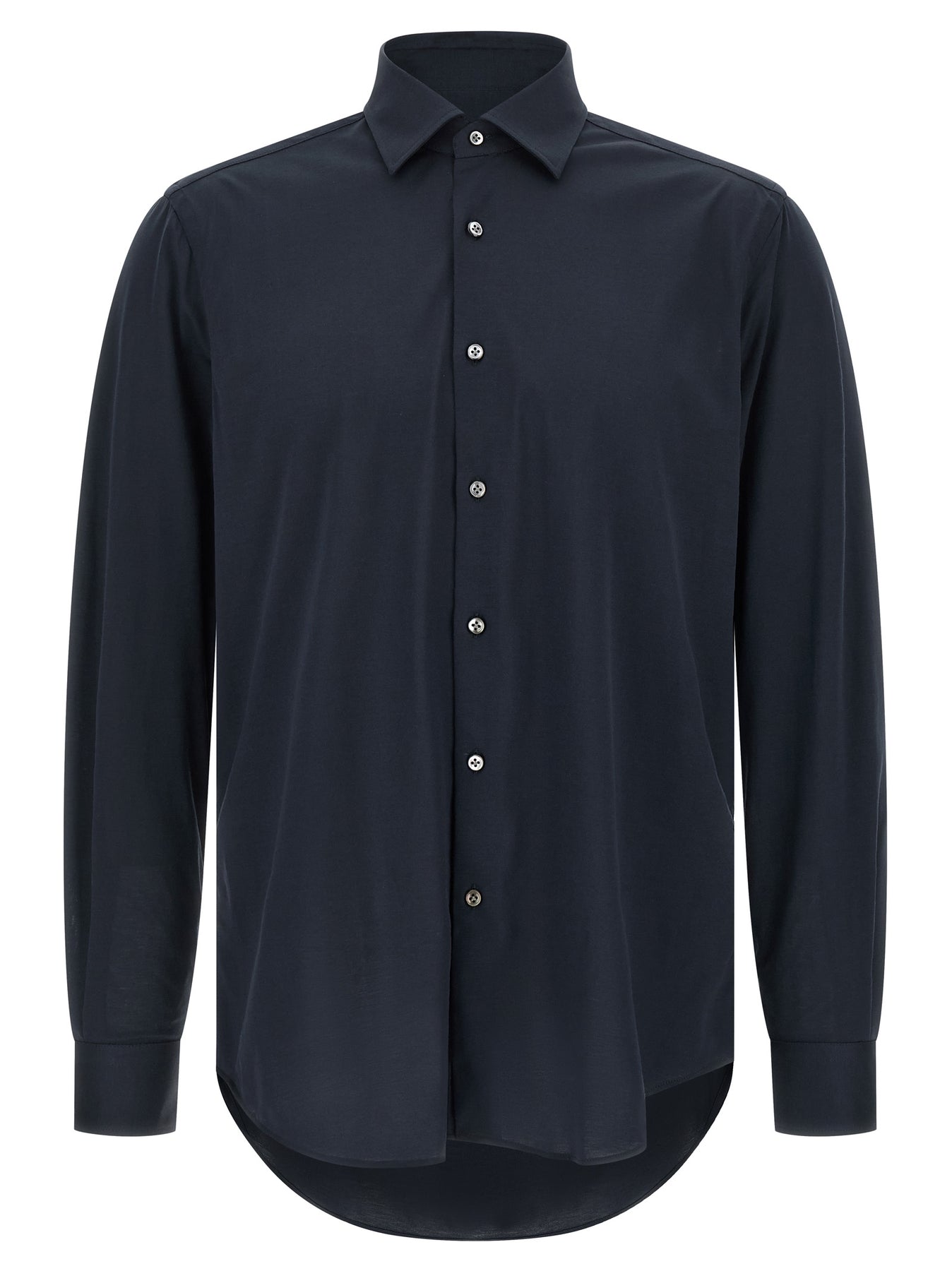 'Effortless' capsule shirt in effortless cotton jersey, Milano collar, front button closure, long cuffed sleeves, rounded hem.