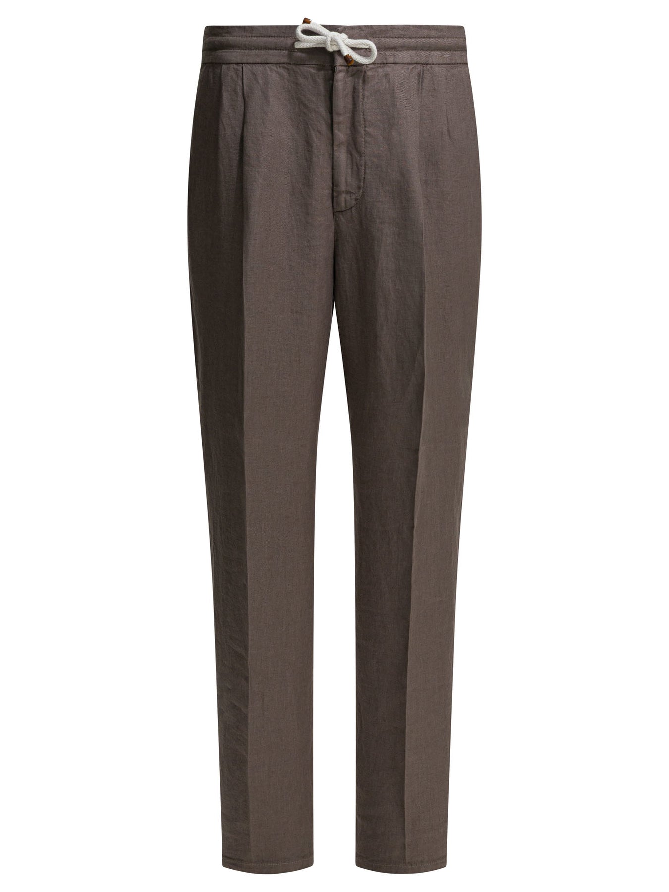 Brunello Cucinelli casual pants made of compact, lightweight weave linen gabardine. The construction of the garment includes double front darts, regular waist with a zippered closure, metal hook and eye, counter button and integrated drawstring. The front pockets emphasize the leg line, while the back pockets are welted. Finished garment dyeing creates slight visible shading on clearly outlined edges and seams. || - Solid color - Mid-rise - Dyeing done on finished garment - Double front darts - Zipper, metal hook and eye, counter button and drawstring closure - American-style front pockets - Back welt pockets - Plain bottom - Regular fit