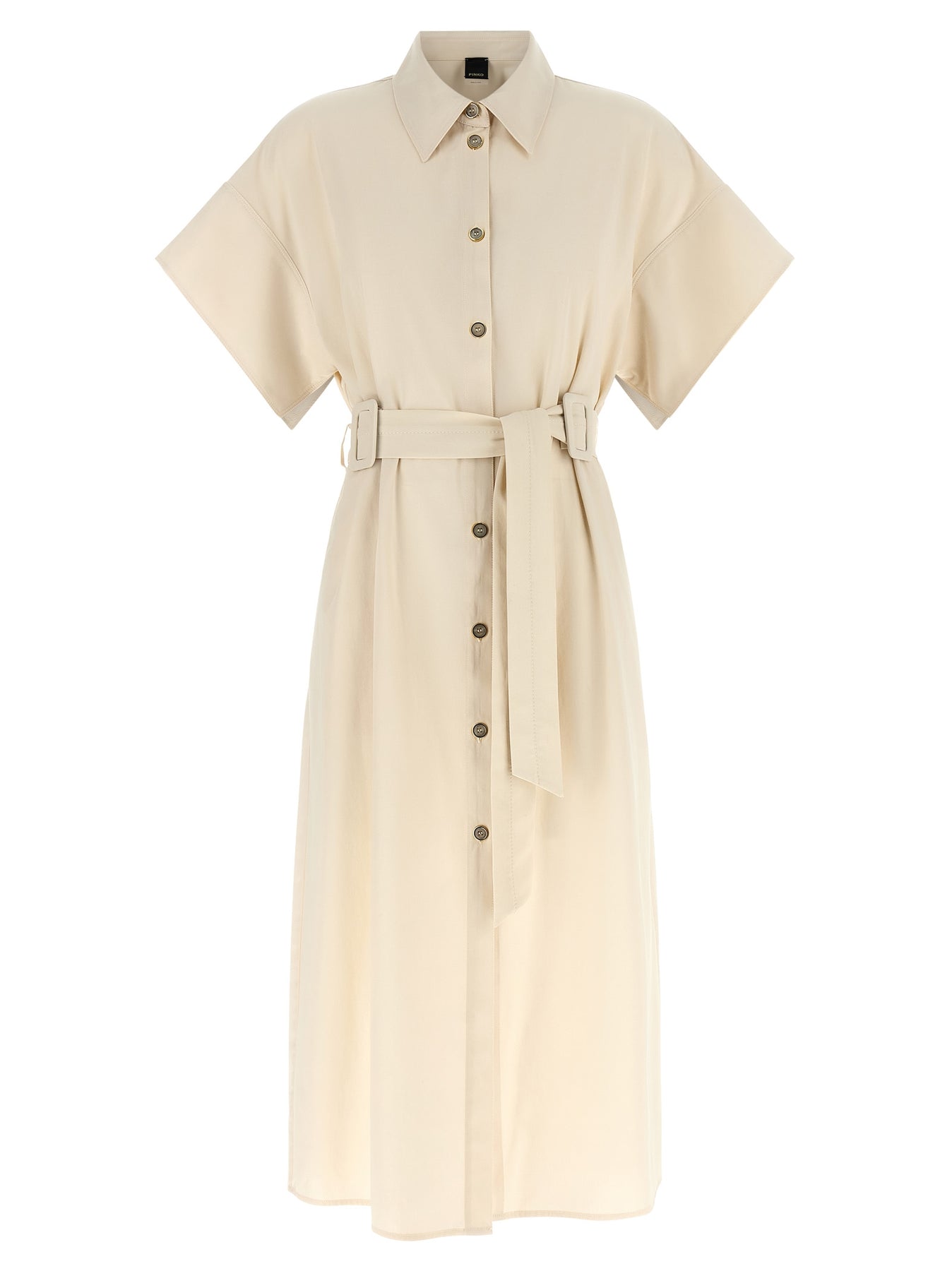 'Alesha' cotton midi dress with chemisier style, front button closure, pockets, short sleeves with slit underneath, adjustable belt.
