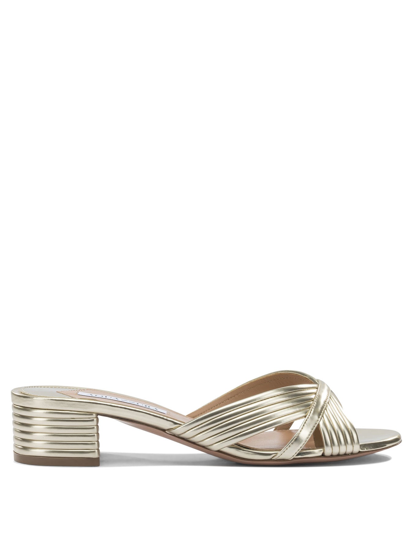 Aquazzura "Sundance 35 mm" heeled sandals, constructed with leather upper and thin straps woven to form crisscrossed bands at the front. The mule model features slip-on construction and an open toe. The structured medium heel provides stability, while the silhouette is balanced and defined by essential lines. The insole is logoed and the sole made of leather. The fit is regular and the construction handcrafted. || - Mule with slip-on construction - Leather upper with woven straps - Open-toe design - Crisscross straps on the front - Structured low heel - Logo-embossed insole - Leather sole - Regular fit