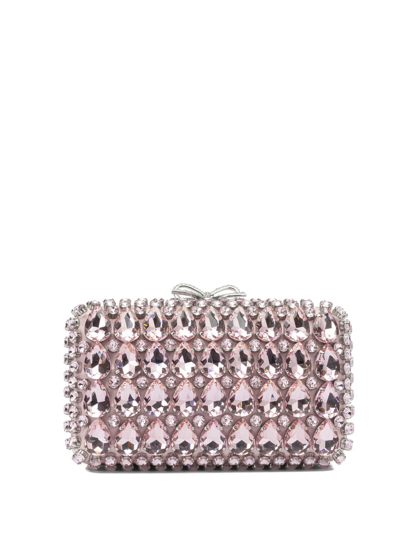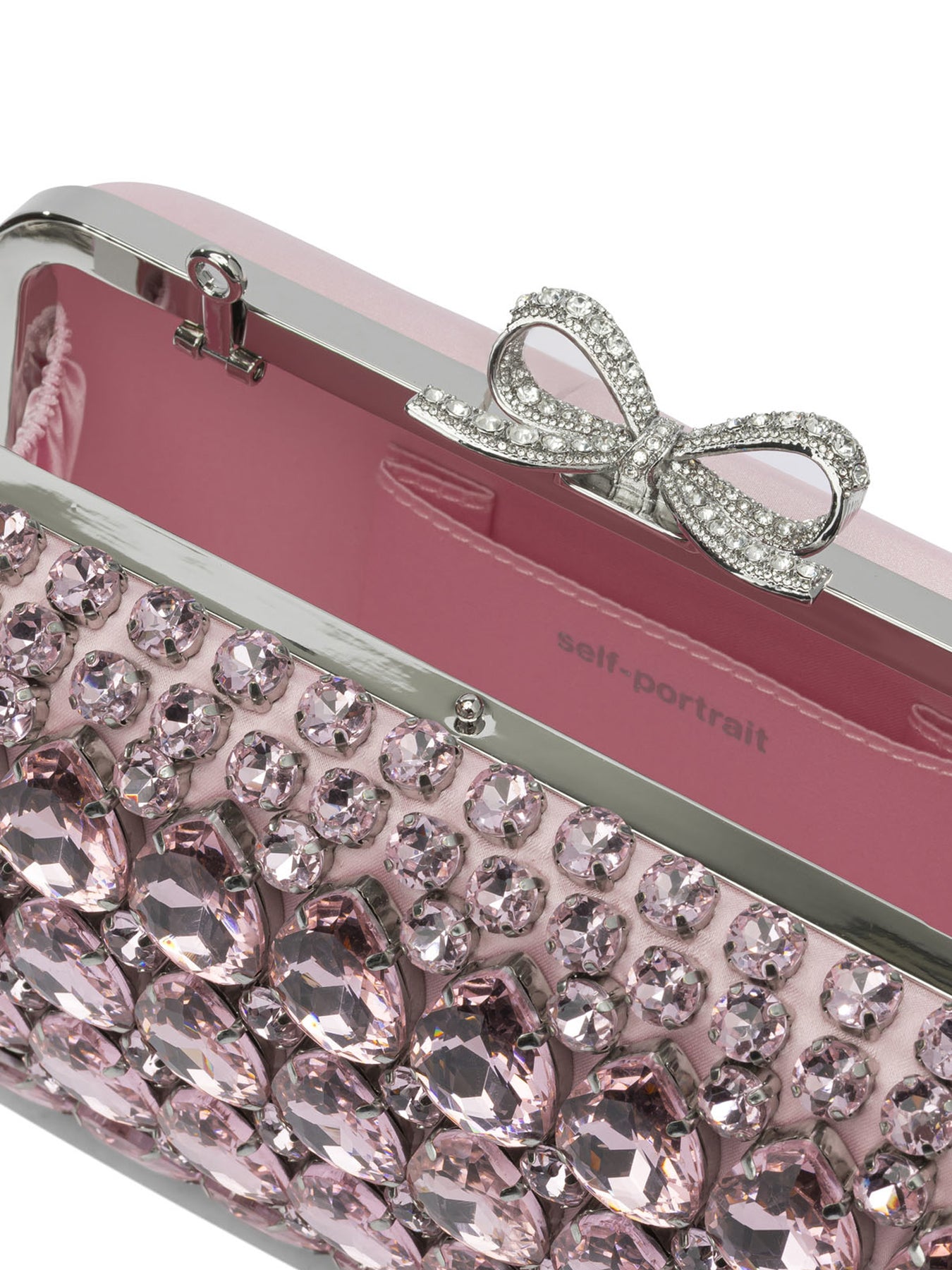 Self-portrait crystal clutch crafted with rigid structure and satin surface embellished with oversize crystals. The construction features a compact silhouette with a buckle top closure that maintains a linear profile. The product features an applied crystal bow motif on the front and includes a removable shoulder chain that allows for different types of wearability. || - Satin exterior with oversize glass crystal applique - Crystal bow motif on the front - Metallic buckle closure - Removable shoulder chain - Interior fabric lining