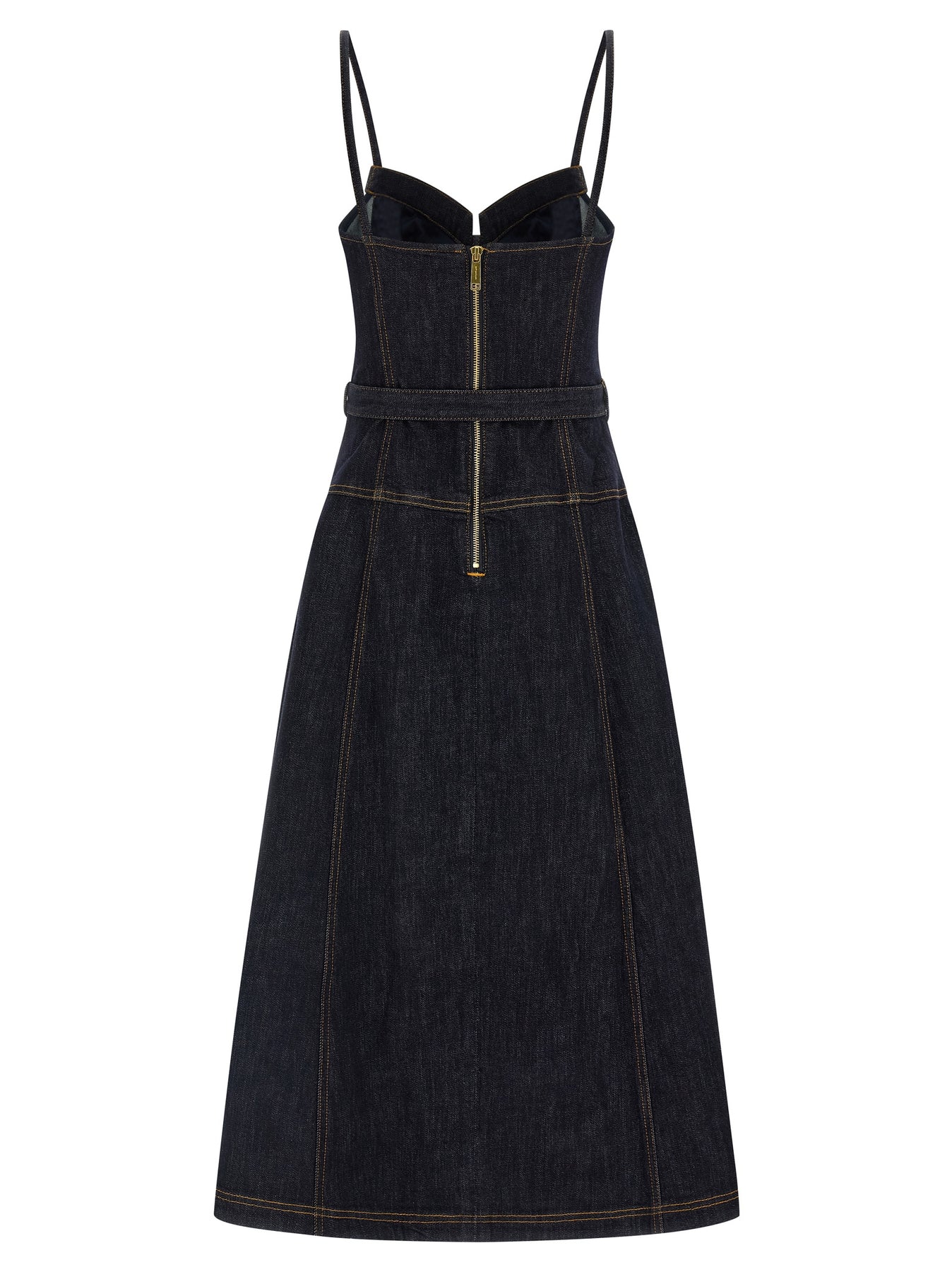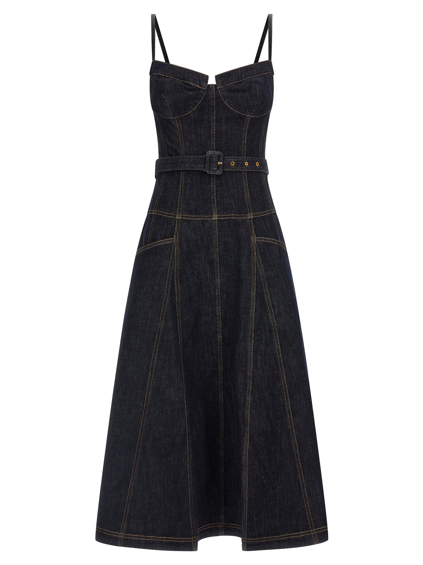 'Indigo Denim Flared Midi' cotton denim dress with contrast stitching, sweetheart neckline, thin straps, back zip closure, flared full skirt, pockets, removable matching belt.