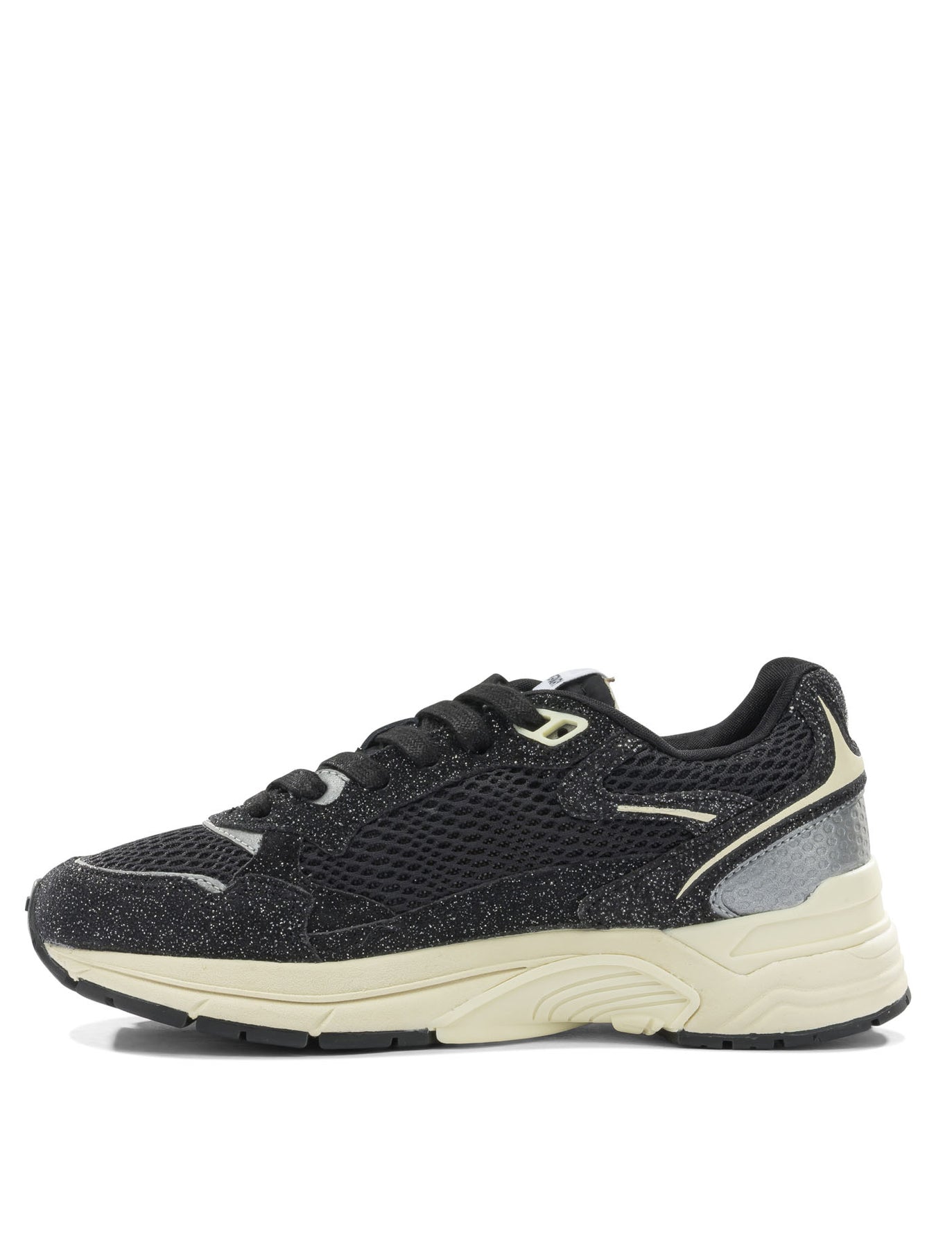 Autry "Hyperway" sneaker, paneled construction with upper made of lightweight mesh and leather with glitter finish. Construction integrates an Action Cush internal cushioning system, PI outsole with TPR stabilizer positioned for stability. Contoured profile, nylon tongue, padded collar and embossed leather back counter. Jacquard elements on tongue label and side, cotton terry lining. || - Suede and mesh upper - Mesh toe cap - Cotton flat laces - Nylon tongue - Padded mesh collar - Cotton terry lining - Raised insole 1.5 mm, mesh-lined - PI outsole, height 3.5 cm - Integrated TPR stabilizer for support
