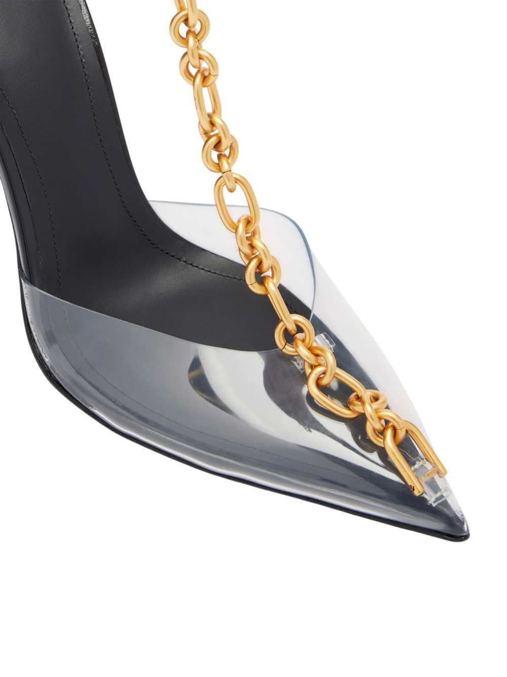 Embellished PVC Slingback Pump Balmain`s bold and glamorous aesthetic blends Parisian tailoring with high-impact opulence. Crafted in Italy, these pumps feature a tapered silhouette with a leather sole, defined by a bold chain appliqué and a buckled strap. Upper: Synthetic Lining: Synthetic Sole: Leather insole, leather outsole Color: Transparent Toe: Pointed toe Made in Italy Includes: Shoe box, protective bag Designer Color: Black/Transparent Closure: Strap with metal buckle ID: GN1UA197KPVC