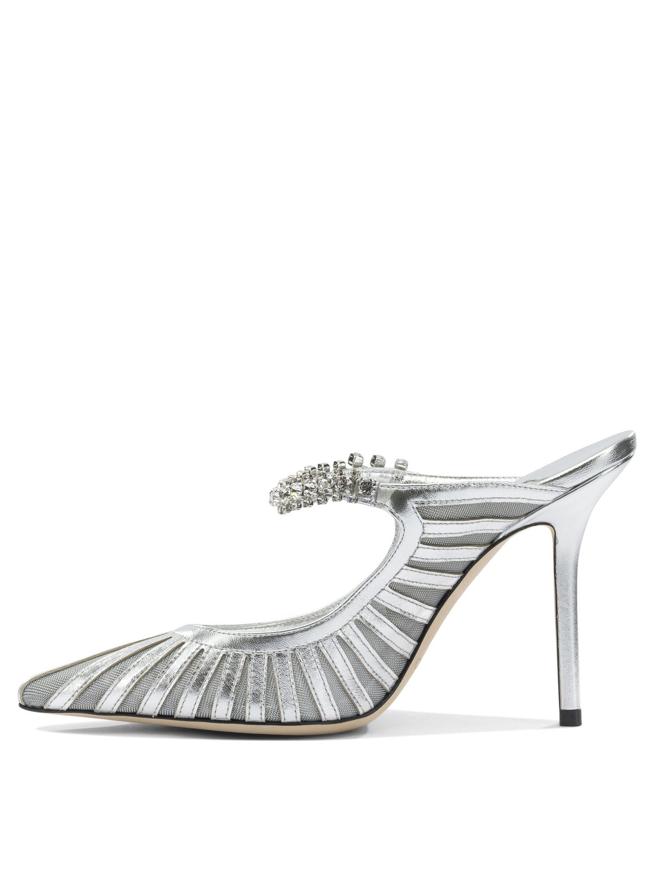 Mule "Bing" 100 mm Jimmy Choo leather upper and thin band embellished with applied crystals. Tapered silhouette with elongated toe and lace-free construction. Features leather lining and smooth leather sole. The rigid silhouette and slender profile are combined with linear decorative elements, giving an essential and functional form. || - Tapered toe - Decorative strap with crystals - Leather upper - Leather lining - Leather sole - Textured construction and exposed detailing