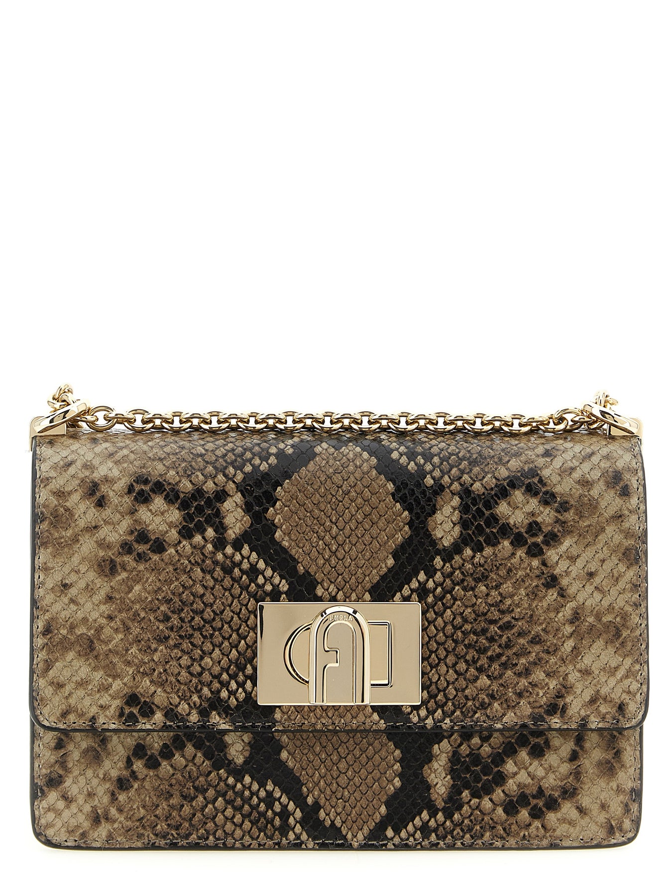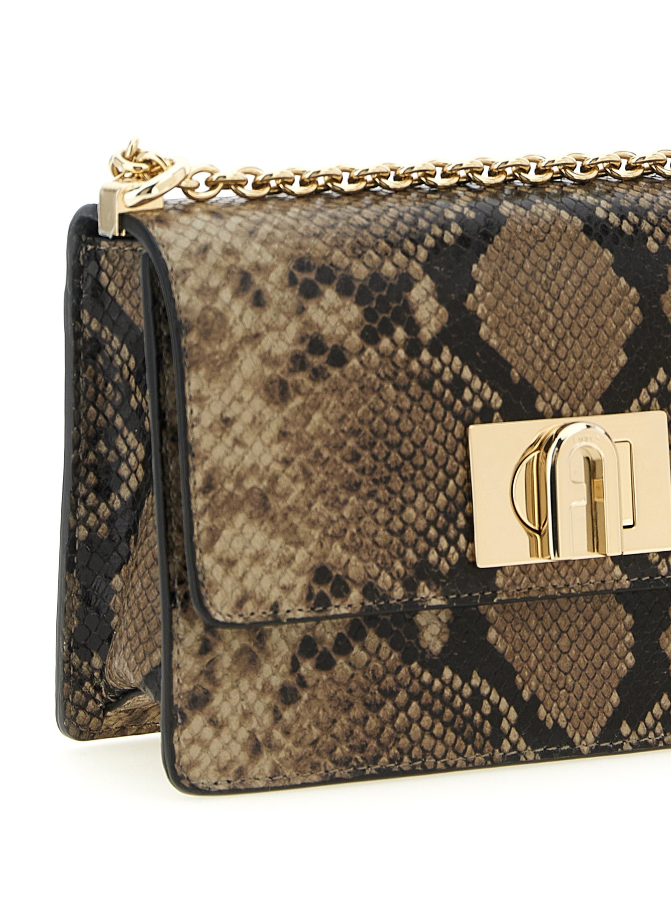 'Furla 1927' mini crossbody bag in python-printed leather with flap closure with metal spin with Arco logo, back pocket, sliding chain shoulder strap with leather shoulder protection.