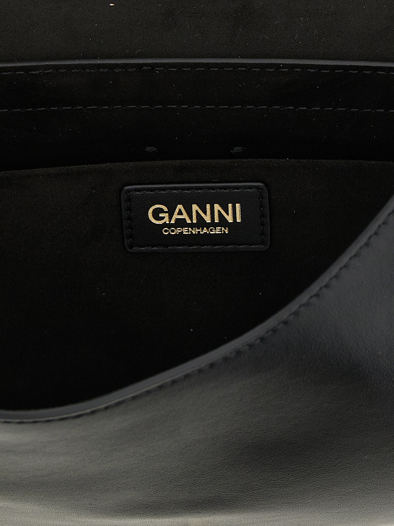 B-Kat shoulder bag in leather-effect fabric with curved silhouette, magnetic flap closure with metal 'GANNI Butterfly' logo on the front, and removable handle.