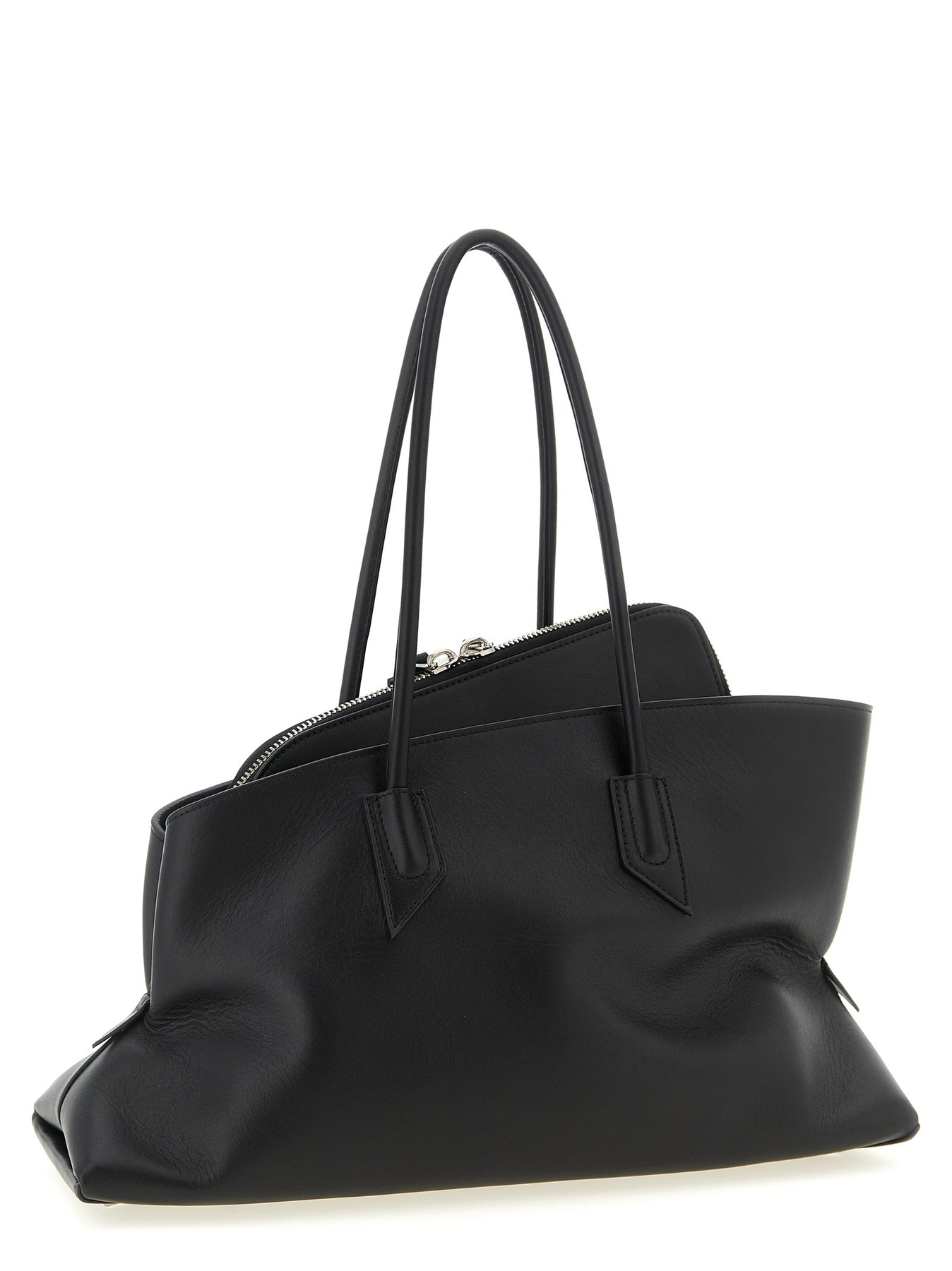 'La Passeggiata Medium' shoulder bag in calf leather, front embossed logo, double fixed tubular handle, top zip closure, side pockets, rigid base with metal logo feet.