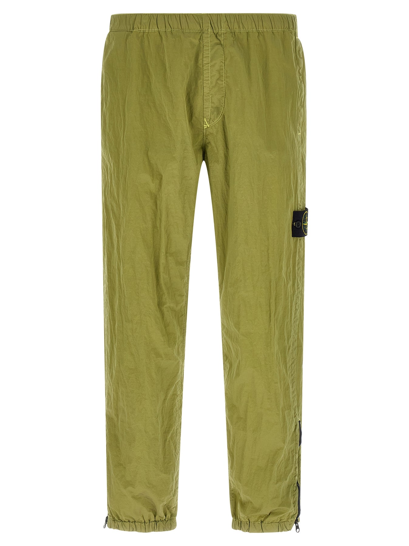 '3100035' joggers in Stone Island Nylon Metal fabric subjected to a double wrinkled effect dyeing process, tapered leg, logo badge applied on the left leg, drawstring elastic waistband, trompe l'oeil flap, pockets, elastic cuffs and zip on the leg bottom. SUSTAINABLE: This product is made of ECONYL regenerated nylon.®