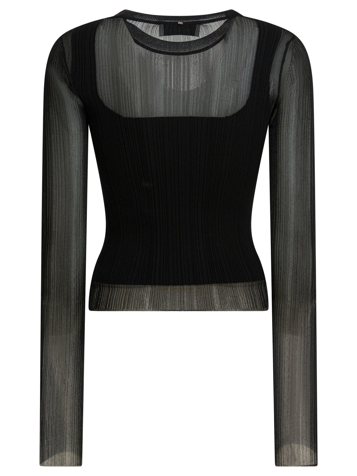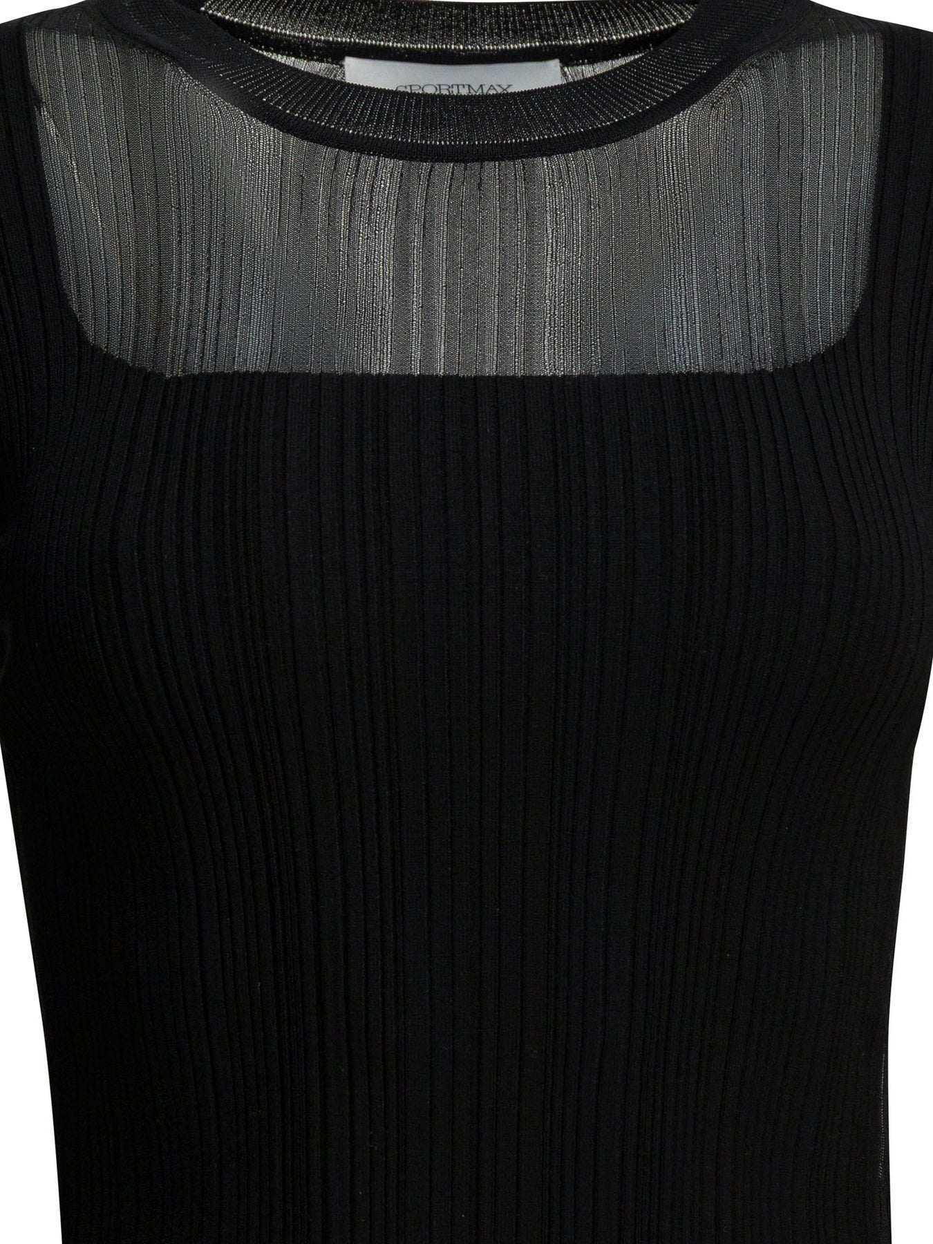 Max Mara Sportmax viscose crewneck T-shirt, constructed from a stretch viscose blend with semi-transparent rib knitting. The contoured structure follows the body line and is distinguished by a trompe l'oeil effect, which modifies the transparency on the bust part creating a camisole silhouette. The knit features a regular fit and enhances the textural texture through the special knit finish. || - Solid color - Long sleeves - Stretch viscose blend - Semi-sheer ribbed knit - Opaque trompe l'oeil effect on bust area - Fitted silhouette with camisole structure - Regular fit