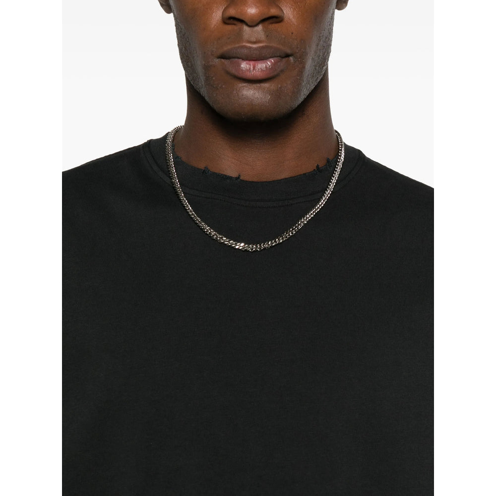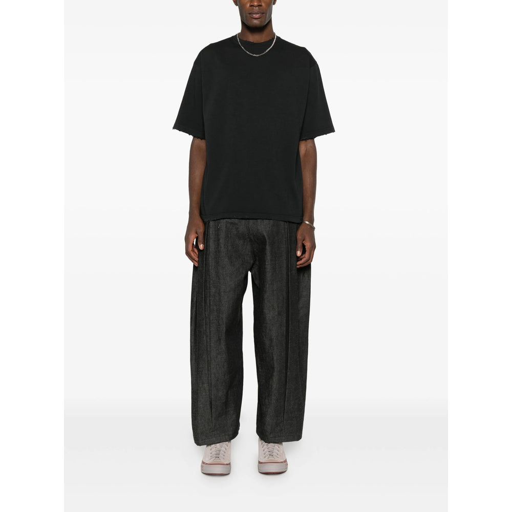 black round neck short sleeves frayed hem frayed cuffs tonal stitching