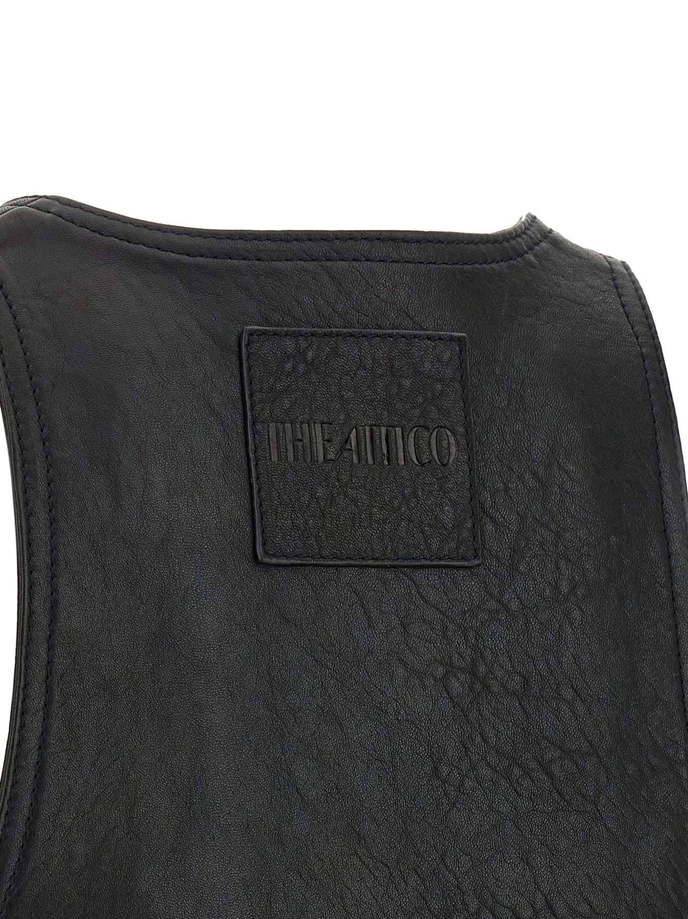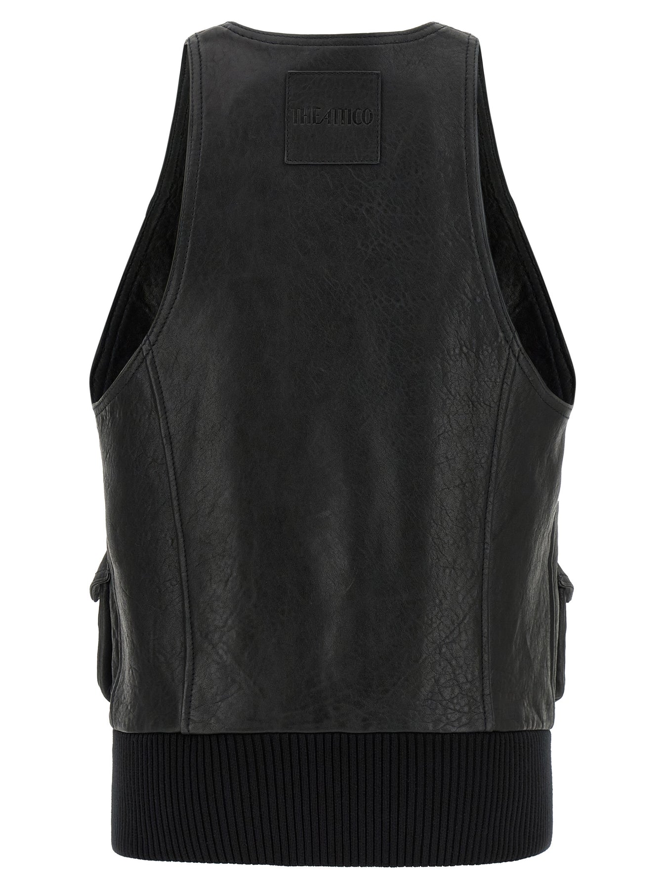 Hammered leather blouson vest with wide armholes, wide round neckline on the front, front zip and snap button closure, pockets, tone-on-tone logo patch on the back, ribbed stretch knit band on the hem.