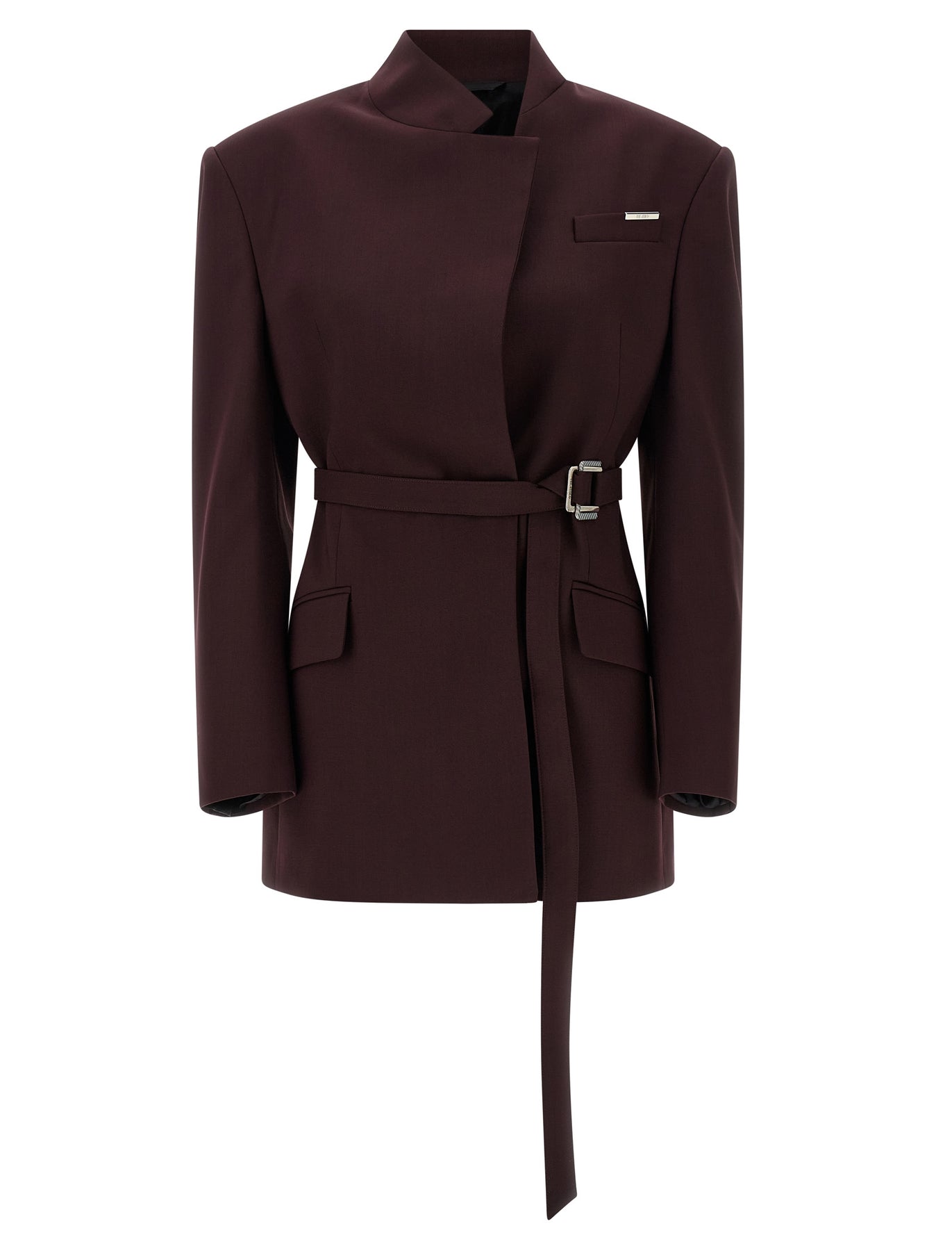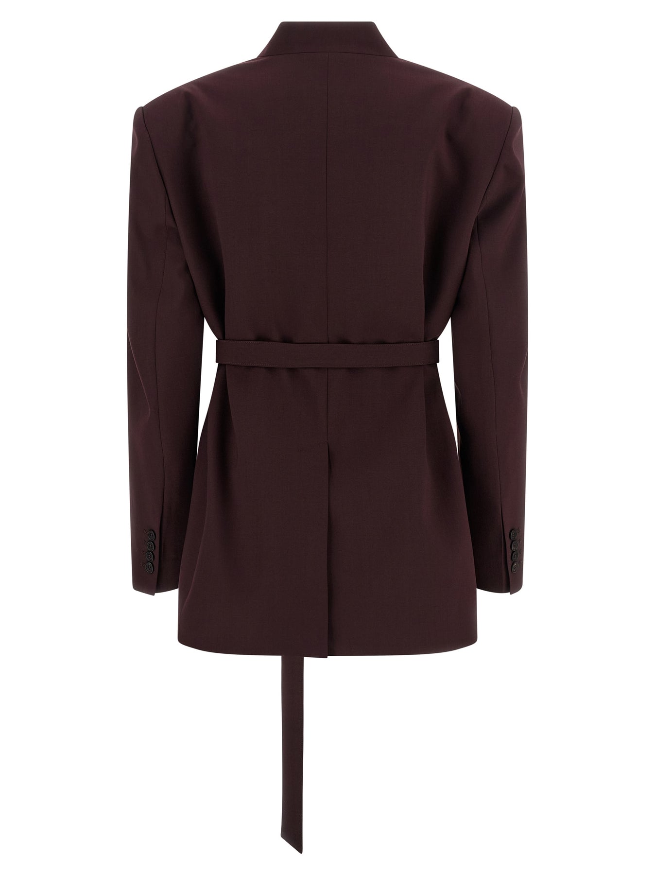 Single-breasted wool gabardine blazer with front asymmetric button closure, monogram viscose lining, standing collar, pocket with metal plaque with engraved logo, flap pockets, maxi padded shoulder strap, long sleeves, back split, removable matching belt.