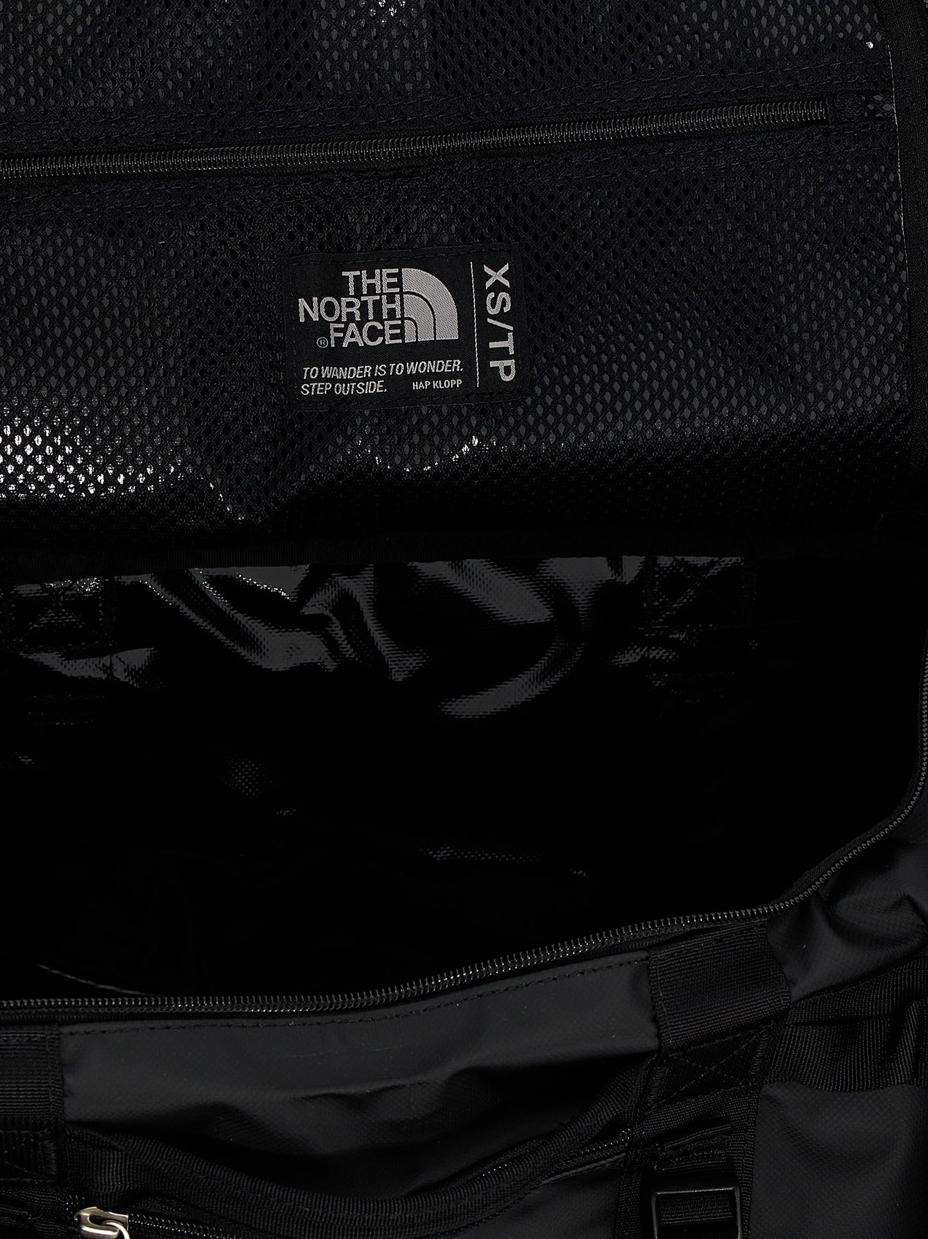 'Base Camp Duffel XS' duffel bag in water-resistant Base Camp technical fabric, zip closure, adjustable and removable shoulder straps, two padded side handles, D-opening with zip and flap, main compartment with mesh pocket closed by zip and pocket on the end, four compression straps, transparent document pocket on the top. Mesh bag to carry or store your duffel bag. SUSTAINABLE: product made from recycled materials.