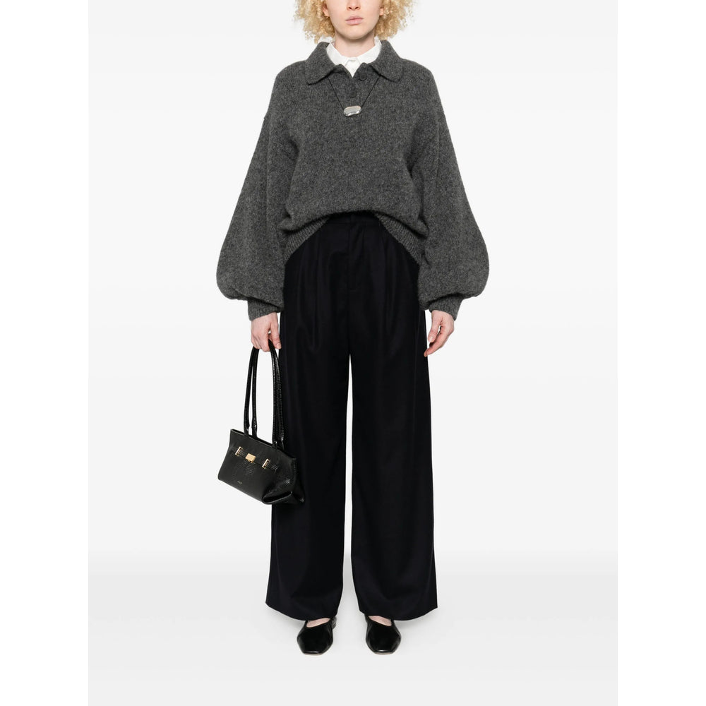 charcoal grey polo neck button placket bishop sleeves ribbed cuffs and hem