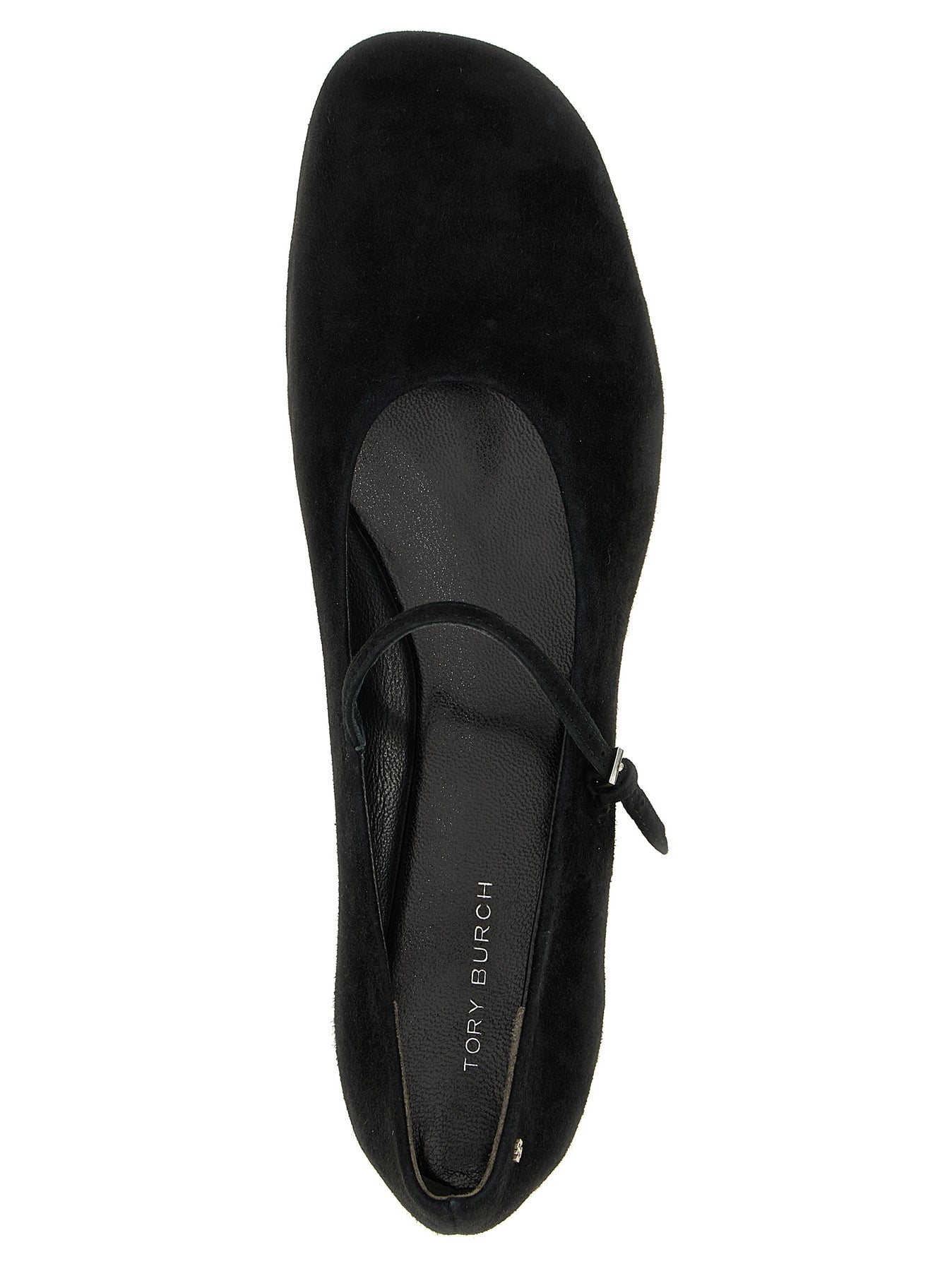 'Mary Jane' suede ballet flats with adjustable strap, metal logo appliqué, leather sole.