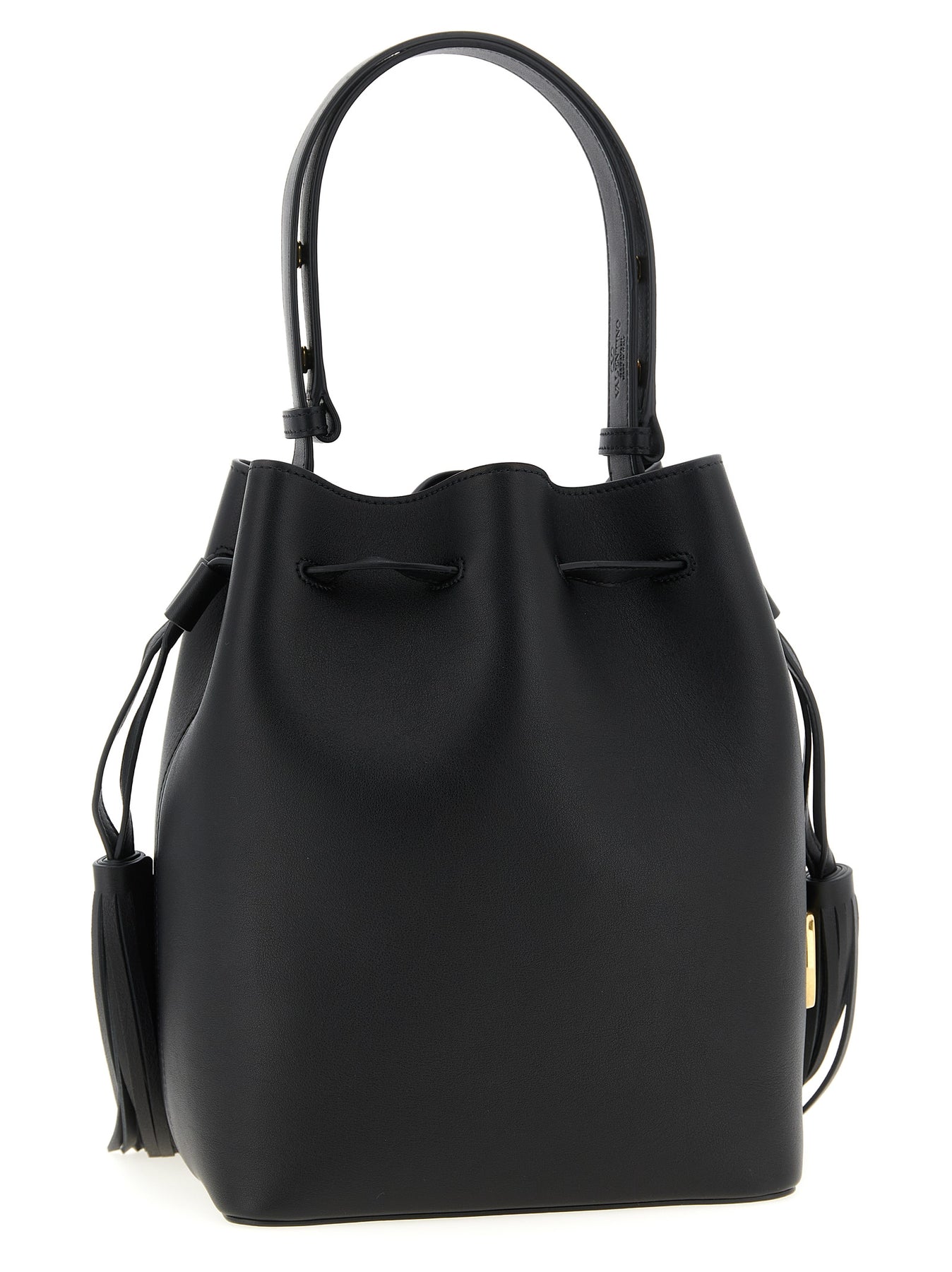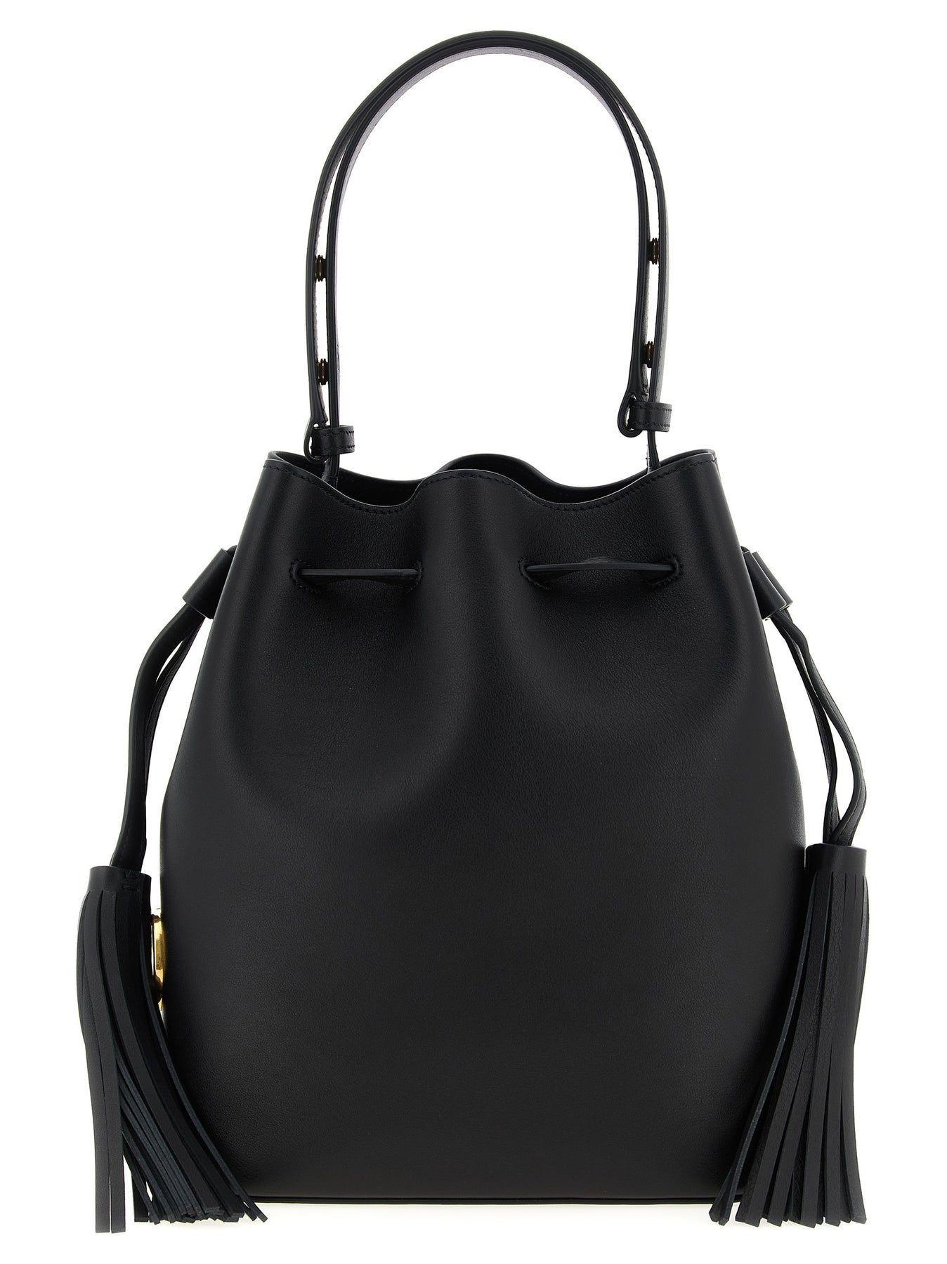Calf leather shoulder bag, VLogo Signature in antiqued metal on the side, adjustable handle, drawstring closure with tassels.