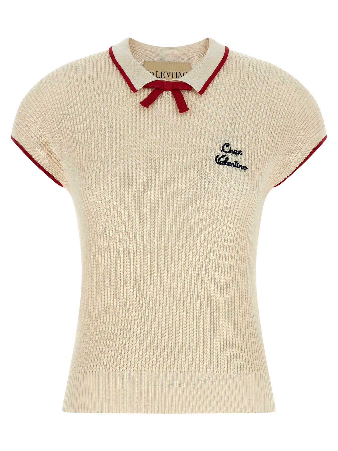 Knitted stretch cotton and viscose blend top with contrast details, 'Chez Valentino' embroidery and collar with bow detail at the front, short sleeves with cuffs, and band on the hem.