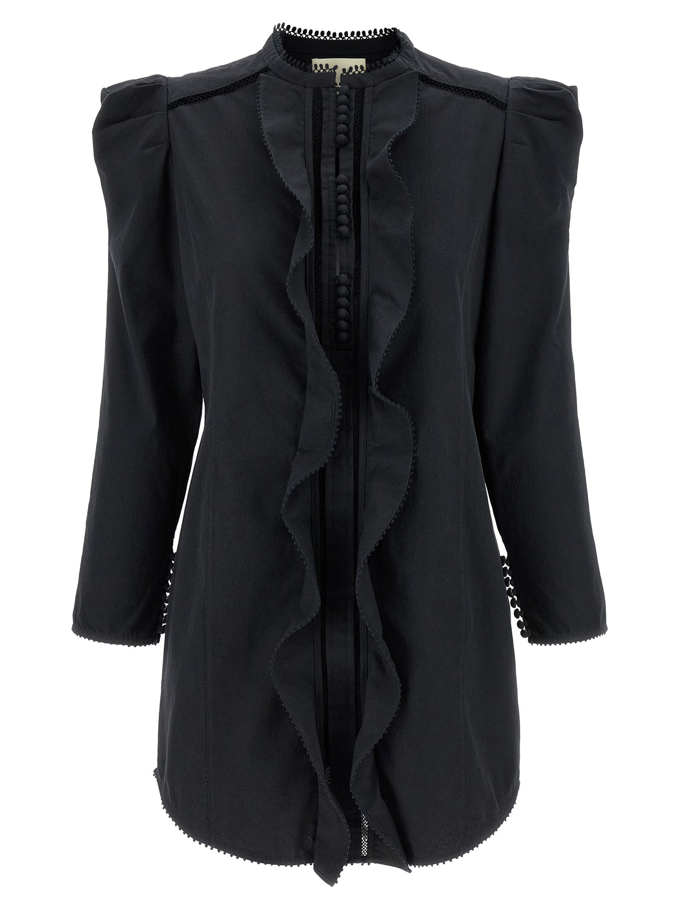 Victorian cotton mini 'Chantal' dress with ruffle inserts, mesh fretwork and crochet finish, crew neck, front button closure, long puff sleeves with buttons and slit on the sleeve bottom.