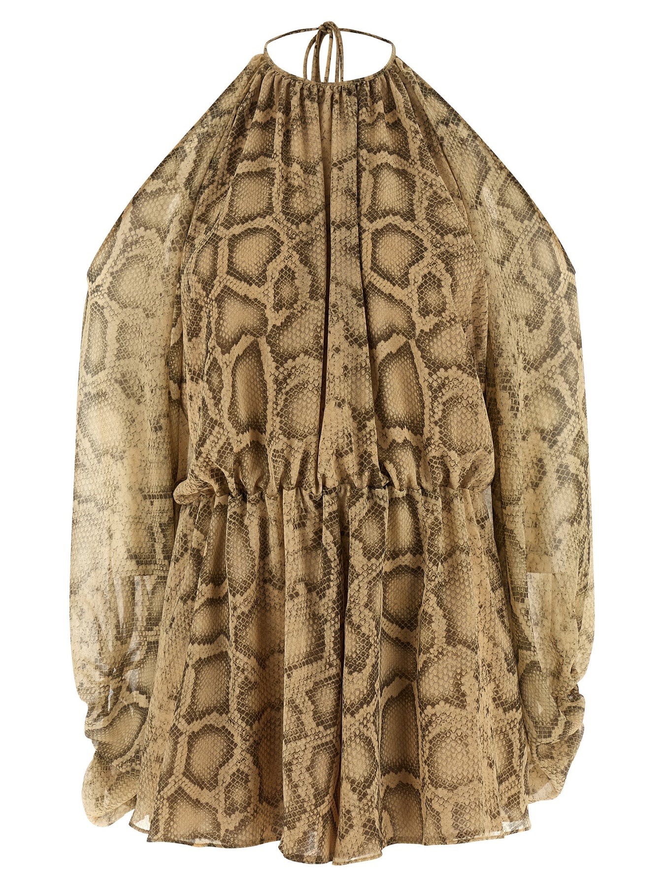'Vesta' georgette jumpsuit printed with natural python motif, crew neck with tie at the back, bare back, drawstring elastic waistband, long puff sleeves with cut-out shoulder and elastic cuffs, shorts with lining and wide leg, asymmetric hem.