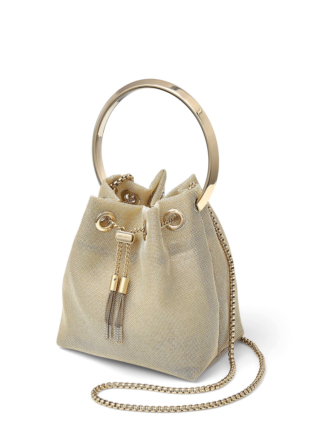 Closure with adjustable metal drawstring with tassels Metal handle and chain shoulder strap Single compartment with internal logo label Made in Italy Mesh W: 15 cm x H: 15 cm x D: 12 cm SKU: BONBONWDFCHAMPAGNE