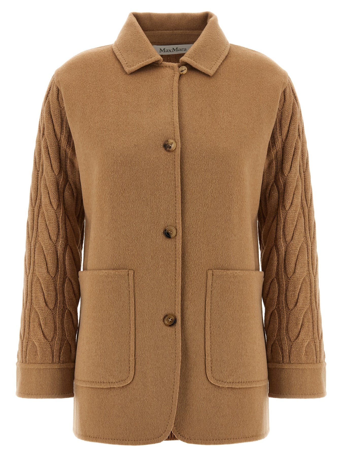 Tacco' camel wool braided coat with carded front, tone-on-tone leather logo patch at the back, collar, front button closure, pockets, long cuffed sleeves, side slits.