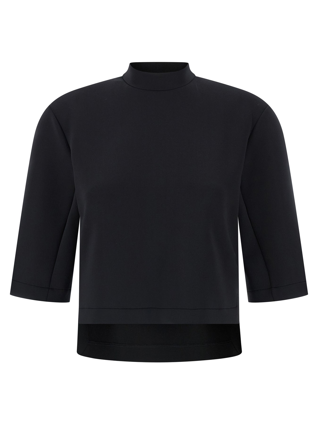 Moncler x Edward Enninful top in scuba-effect fabric, crop model, high neck with tone-on-tone logo patch at the back, short sleeves, side slits, and asymmetrical hem.