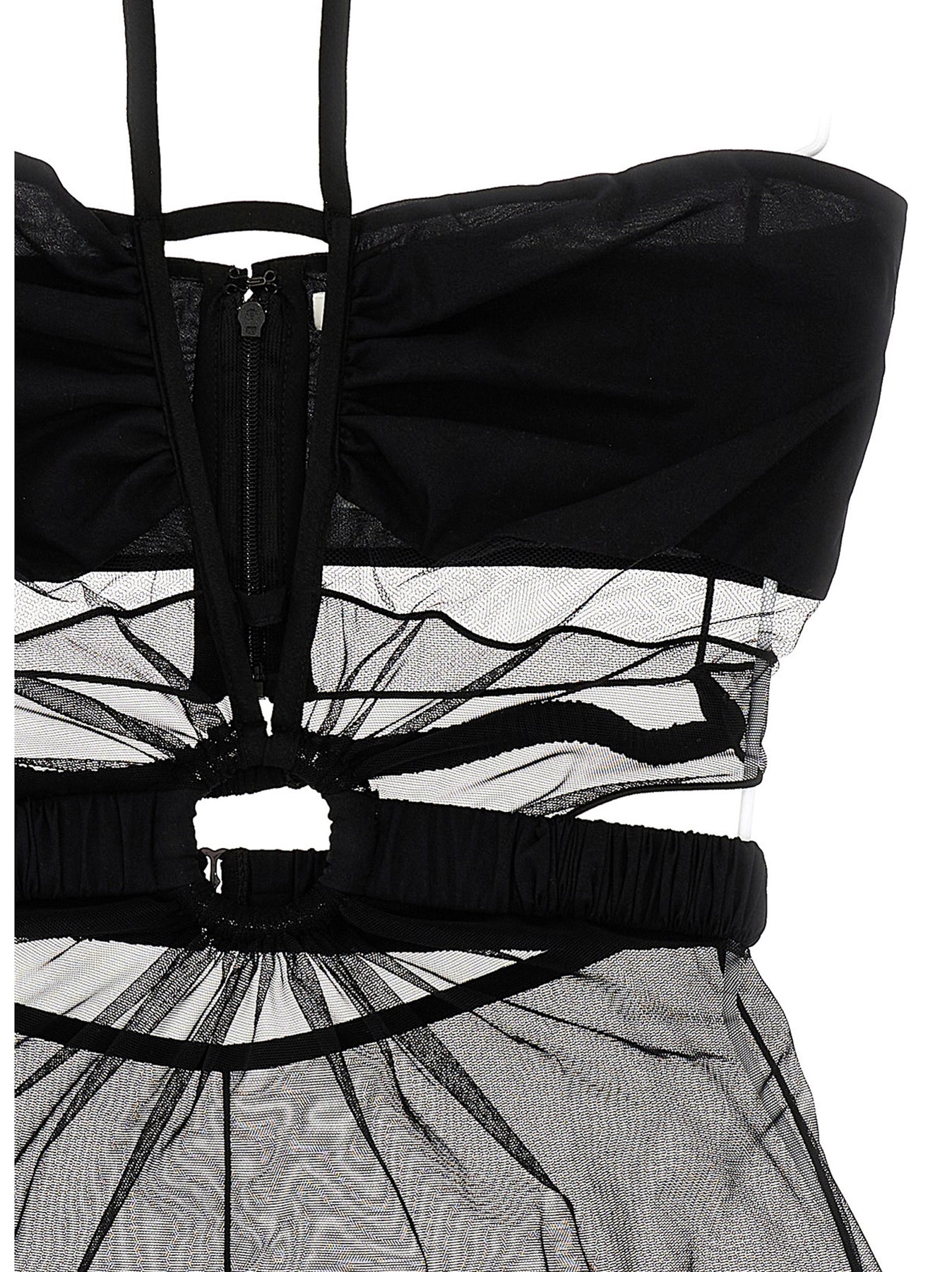 Ring' mesh fabric bodysuit with cut outs, bare back, deep V-neck, adjustable shoulders.